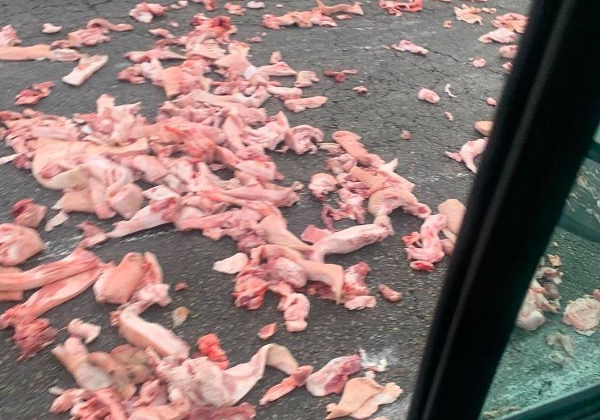 La escena sorprendió a los conductores que circulaban por la vía que conecta Santa Olaja con Puente Castro: orejas, patas y diversas extremidades destinadas a la fabricación de piensos animales quedaron esparcidas por la calzada.