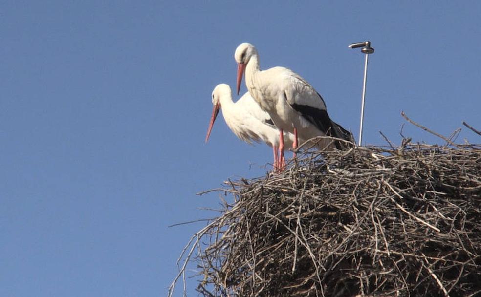 Tres parejas de cigüeñas que, en su ruta migratoria hacia el Norte, vuelven cada año a Valverde de la Virgen anunciando la llegada del buen tiempo.