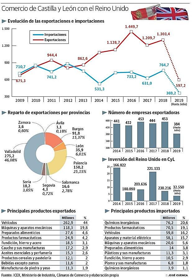 No en vano, el 'brexit' entra en su cuenta atrás justo cuando el comercio de las empresas de la comunidad autónoma con el Reino Unido se encuentra en el mejor momento de su historia. Y el problema se agrava porque el conjunto de las exportaciones castellanas y leonesas viven su peor momento en tres años. Castilla y León no puede permitirse perder ese siete por ciento que representan las ventas de sus empresas en los actuales dominios de Boris Johnson sin que toda su economía se resienta. No en vano, están involucrados algunos de los sectores 'sistémicos' de la región: el automóvil y la agroalimentación.