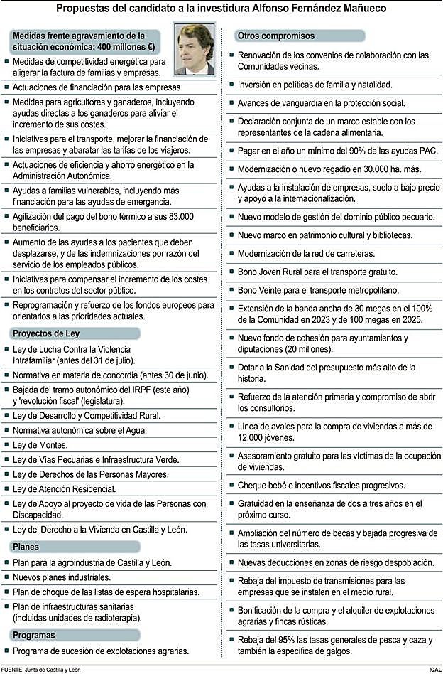 Fernández Mañueco, en presencia de Santiago Abascal, defendió el estado de las autonomías y las políticas aplicadas por la Unión Europea. Para la etapa de gobierno con Vox, ofreció la aprobación de once leyes, entre ellas de desarrollo y competitividad rural, de atención residencial -de la pasada legislatura- o de derechos de las personas mayores.