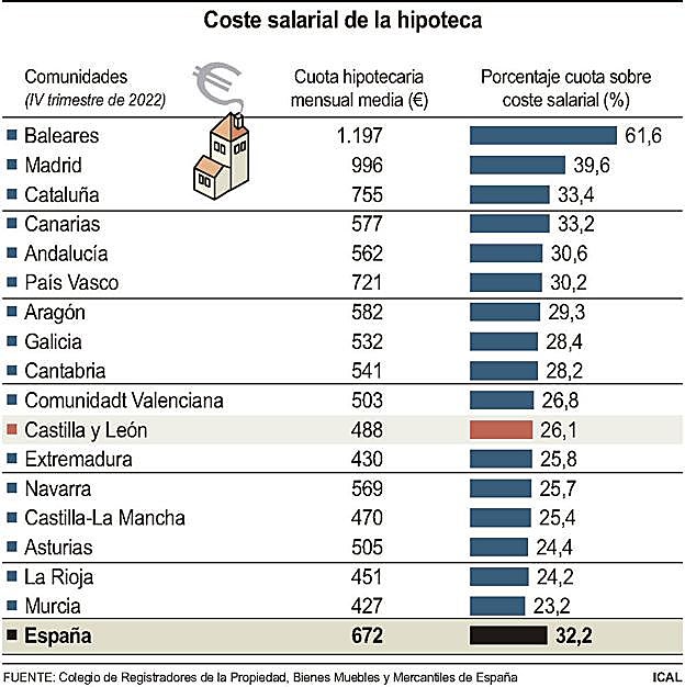 La hipoteca se lleva ya, a primeros de cada mes, una media de 488 euros de la nómina de los castellanos y leoneses, como consecuencia de la escalada de tipos de interés de los últimos meses. La senda alcista, que lleva el Euríbor a acercarse al cuatro por ciento, complica el acceso a la vivienda en propiedad, también en la Comunidad, puesto que la cuota del préstamo absorbe el 26,1 por ciento del salario de los trabajadores.
