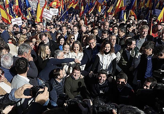 «Por eso desde Castilla y León, desde el PP de Castilla y León, vamos a seguir construyendo una España fuerte, cohesionada, que apuesta por la igualdad, la libertad y la justicia en España y para todos los españoles. Y eso es lo que vamos a hacer hoy aquí, pero también en todos los ámbitos y cauces desde el PP de Castilla y León», prosiguió Fernández Mañueco, que fue uno de los 14 'barones' autonómicos del PP que asistió a la concentración, todos menos los de Canarias, Cantabria y Galicia. Además, apoyando al líder del PP, Alberto Núñez Feijóo, también se ha podido ver a los dos expresidentes populares del Gobierno, José María Aznar y Mariano Rajoy, así como a cientos de alcaldes de toda España.