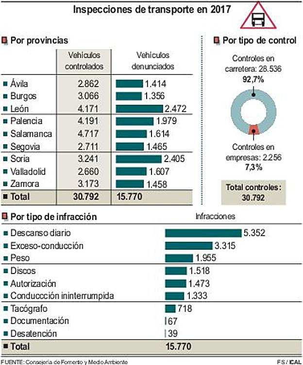 La mitad de los transportistas inspeccionados por los servicios de la Consejería de Fomento, en colaboración con la Guardia Civil y las policías locales, terminan denunciados en Castilla y León. En la mayoría de los casos, las infracciones están vinculadas con los tiempos de conducción y descanso, puesto que representan tres de cada cuatro expedientes sancionadores abiertos en los controles realizados en carretera y en las visitas a empresas.
