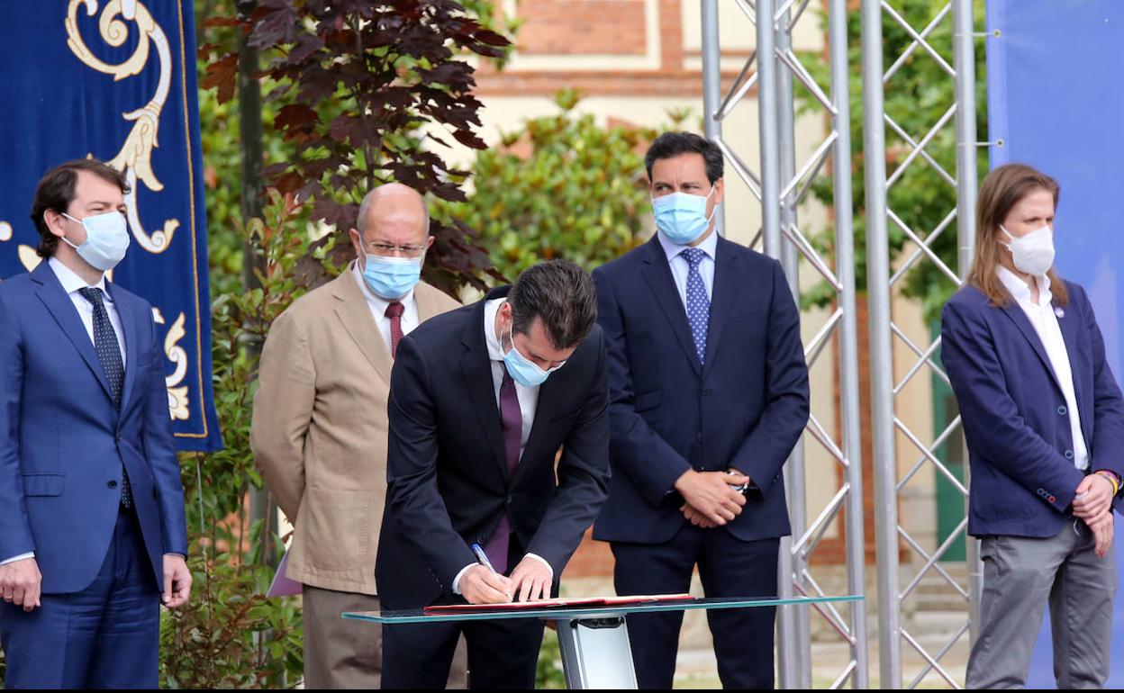 El presidente de la Junta de Castilla y León, Alfonso Fernández Mañueco, junto al vicepresidente, Francisco Igea, han suscrito hoy un histórico Pacto para la Recuperación Económica, el Empleo y la Cohesión Social en la comunidad con los portavoces parlamentarios del PSOE, Luis Tudanca, del PP, Raúl de la Hoz, de Ciudadanos, David Castaño, de Podemos, Pablo Fernández, y de Por Ávila, Pedro José Pascual.