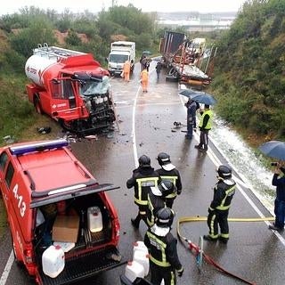 Dos heridos en un espectacular accidente al chocar frontalmente dos camiones