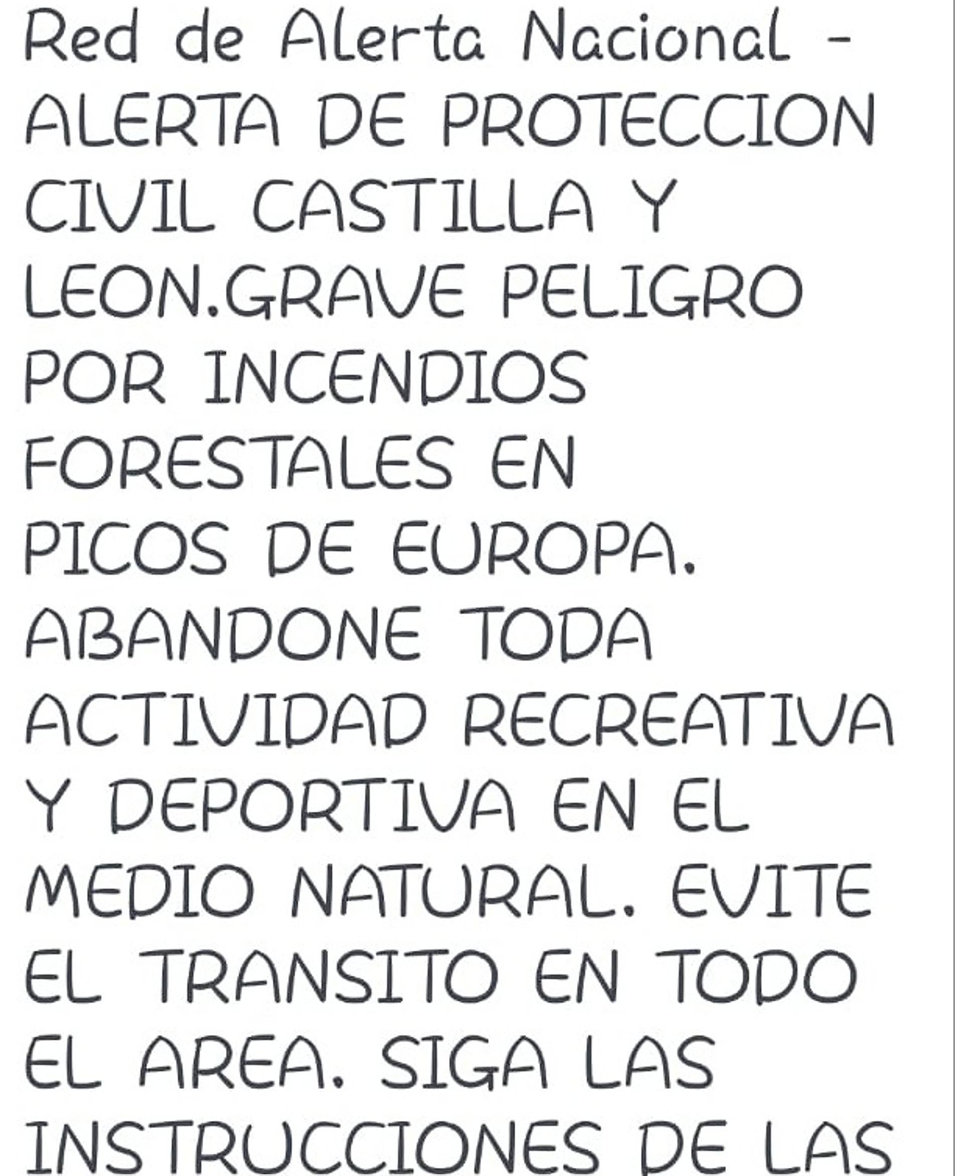 Vecinos de zonas de montaña de la provincia de León recibieron en la mañana de este sábado una alerta enviada a teléfonos móviles sobre el riesgo de incendios en Castilla y León, en la que se solicitaba a los ciudadanos que abandonasen toda actividad recreativa en las proximidades de los Picos de Europa. El texto, que estuvo acompañado de un pitido intermitente y pedía también extremar las precauciones, se ha extendido al mediodía al resto de la provincia.