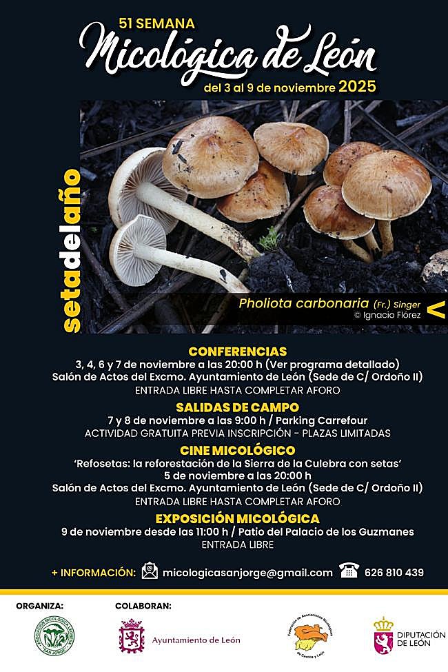Las jornadas comenzarán el próximo lunes, 3 de noviembre, en el Salón de Actos del Ayuntamiento de León, con la conferencia 'Incendios y micorrizas: los hongos y su importancia para los bosques', a cargo del reconocido micólogo leonés Juan Antonio Sánchez Rodríguez, y se clausurará el domingo 9 con una gran exposición micológica, en el Palacio de los Guzmanes, con setas recolectadas en los días anteriores.