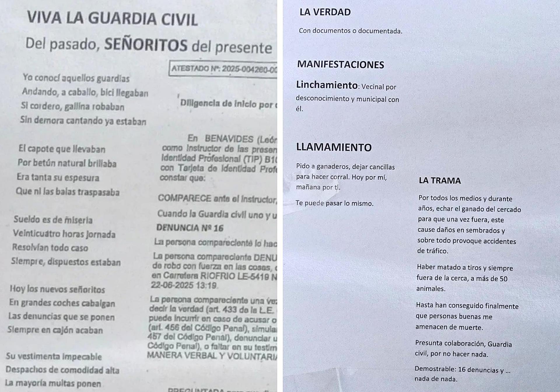 En este escrito cuenta «la trama» desde su punto de vista: «Por todos los medios y durante años, -han intentado- echar el ganado del cercado para que, una vez fuera, éste cause daños en sembrados y sobre todo de tráfico». Acusa a los supuestos responsables de que las vacas campen a sus anchas de que «han conseguido que personas buenas me amenacen de muerte» y a la Guardia Civil de «presunta colaboración» porque considera un hecho «demostrable» que tras «16 denuncias» no haya ocurrido «nada de nada».