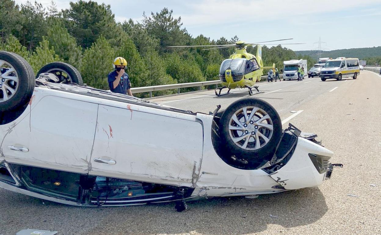 El vehículo presentaba daños tras volcar por completo tras el accidente. El accidente ha sido notificado a las 12:23. El accidente ha generado cuatro kilómetros de retenciones.