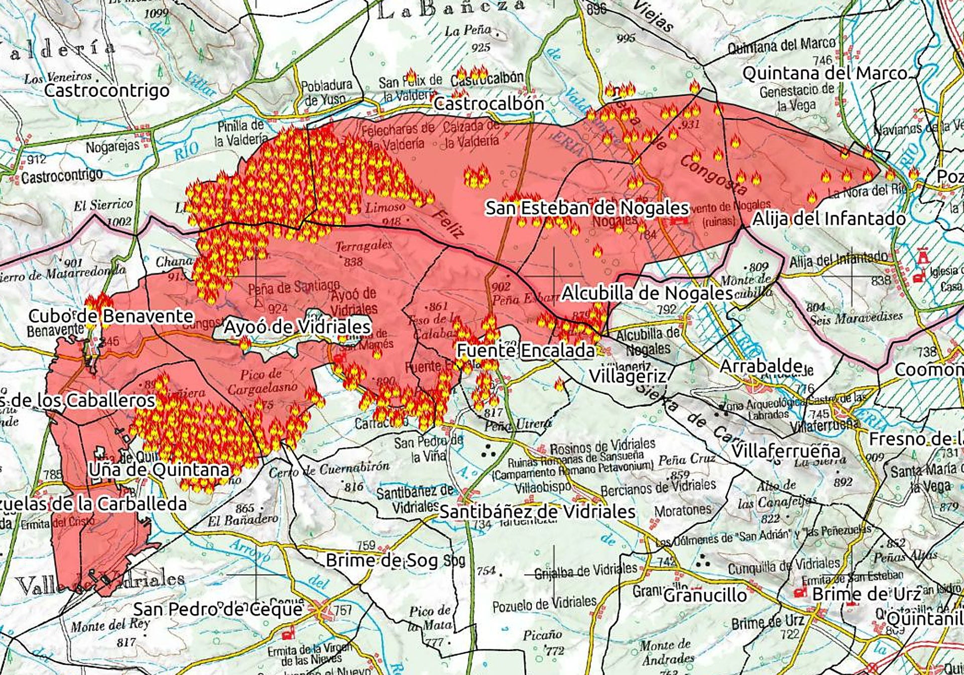 El fuego se originó el pasado domingo en Zamora, concretamente en la localidad de Molezuelas de la Carballeda, pero, el crecimiento progresivo de las llamas, sostenido a su paso por la adversa climatología que imposibilitó cualquier conato de extinción, provocó su salto a la provincia leonesa, donde ya ha asolado algunos de sus pueblos, además de mantener otros amenzados en su quinto día de actividad.