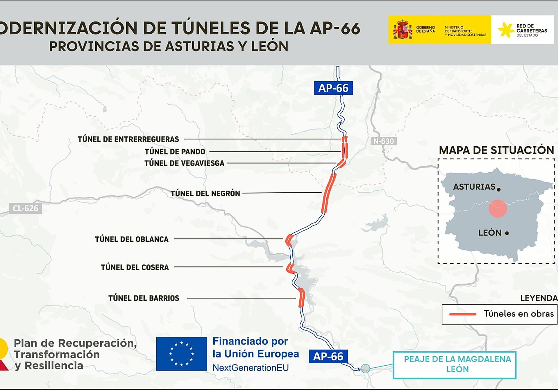 El Ministerio de Transportes y Movilidad Sostenible avanza en la ejecución de las obras de modernización de los túneles de Entrerregueras, Pando, Vegaviesga, Negrón, Oblanca, Cosera y Barrios, situados en la autopista AP-66, León – Campomanes, entre Asturias y León. Esta actuación forma parte del Plan de Recuperación, Transformación y Resilencia (PRTR), que cuentan con una inversión global de 68,14 millones de euros (IVA incluido) con cargo a los fondos europeos.