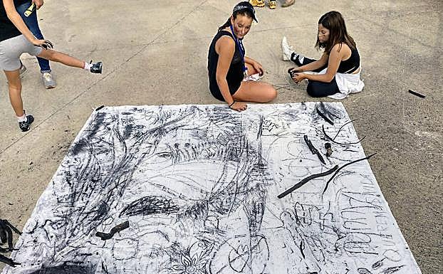 La artista plástica Susana Velasco inició la elaboración de un mural que, sobre lienzo blanco, y pintado con tizones quemados de los restos del fuego que asoló La Cabrera, será expuesto en el Musac