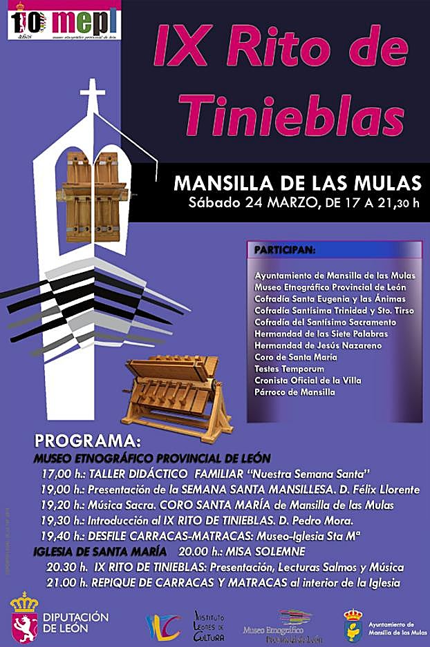 Con un programa doble, cultural y litúrgico que se pone en marcha entre el Museo y la Iglesia Mayor de Santa María de Mansilla de las Mulas, y que ha sido organizado en colaboración con cinco cofradías y hermandades mansillesas y el propio Ayuntamiento mansillés así como el párroco, el Coro de Santa María, el grupo de teatro `Testes Temporum´, el cronista oficial de la villa, además de los vecinos de la villa y visitantes, que darán como resultado la revalorización de esta tradición, así como la realización de un recorrido no solo intelectual por la historia cofrade, este año con el homenaje a la Hermandad de las Siete Palabras, sino también físico procesional de sus idiófonos, las matracas y carracas, desde el Museo Etnográfico hacia la Iglesia.