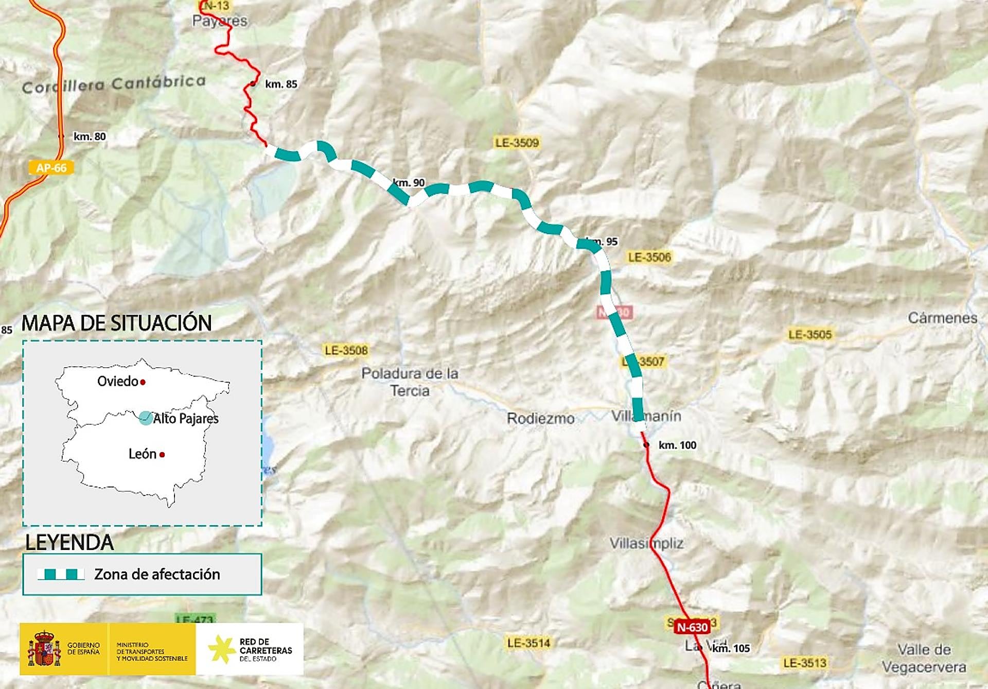 El Ministerio de Transportes y Movilidad Sostenible ejecutará desde este lunes, 2 de junio, las obras de conservación y mantenimiento preventivo de firmes de la carretera N-630, entre el Alto de Pajares y Villamanín, en la provincia de León y límite con Asturias.