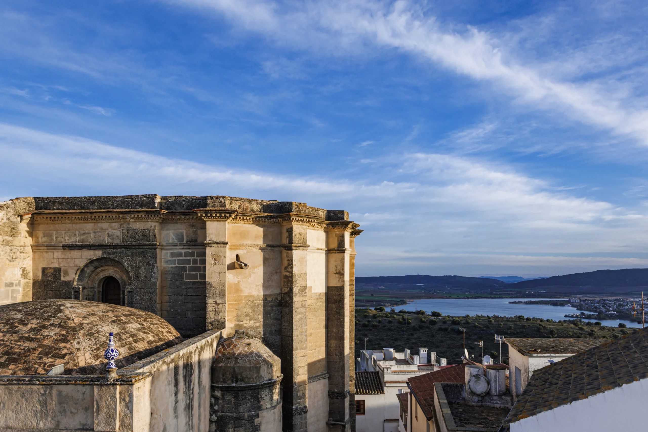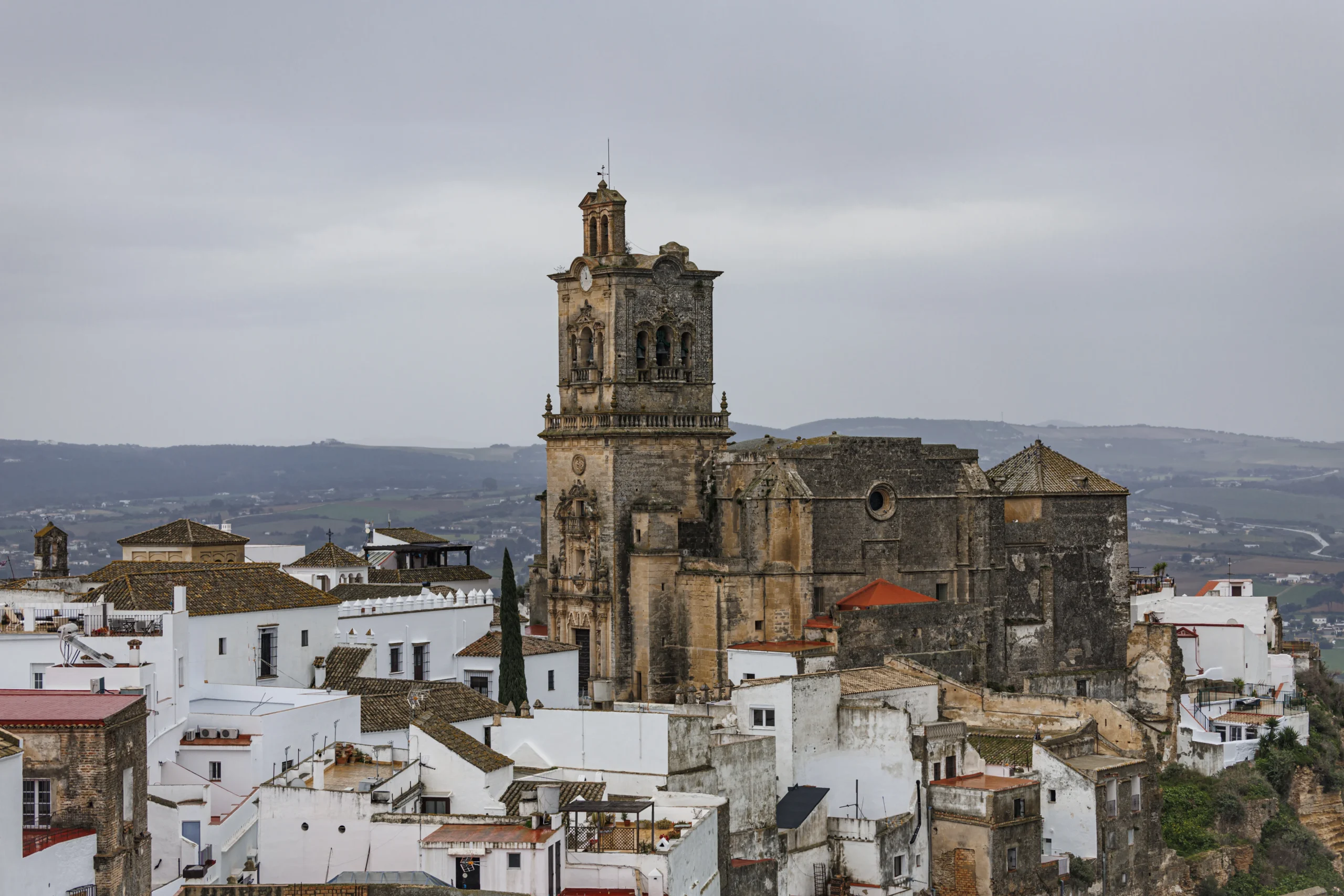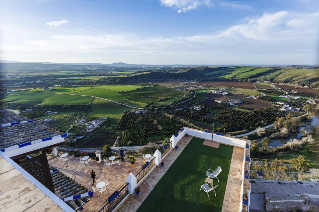 “La puerta a los pueblos blancos de Cádiz” es como lo define el director de su Parador, Francisco Jesús de Manuel. Este beculense, tras casi once años al frente del Parador, ha plantado su corazón en Arcos. Aquí, en la peña que corona el río Guadalete, se contempla el verdor atlántico de su naturaleza que contrasta con las blancas casas. La plaza donde se ubica es pequeña, menuda, con vistas a la campiña y a la historia. “De un lado, en la plaza, la Basílica Menor de Santa María de la Asunción, el castillo de los Duques de Arcos; al otro, los campos que se pierden en el horizonte”, cuenta. La basílica se levanta sobre una mezquita, es de origen mudéjar y data del siglo XIV, posteriormente se convirtió en una iglesia gótica, cuya influencia es la imperante en el interior. El campanario hará las delicias de los aficionados por la arquitectura con sus detalles azules. Su torre, sin embargo, no es la original, se construyó en el siglo XVIII, pues sustituía a una anterior que sucumbió a causa del trágico terremoto de Lisboa de 1755. Por su parte, el castillo ducal, aunque de propiedad privada, fue un antiguo alcázar andalusí del siglo XI. El origen musulmán del edificio se mezcla con las reformas de los siglos XIV y XV; de la primera época conserva el gran arco de herradura de la entrada y una parta de su muralla.