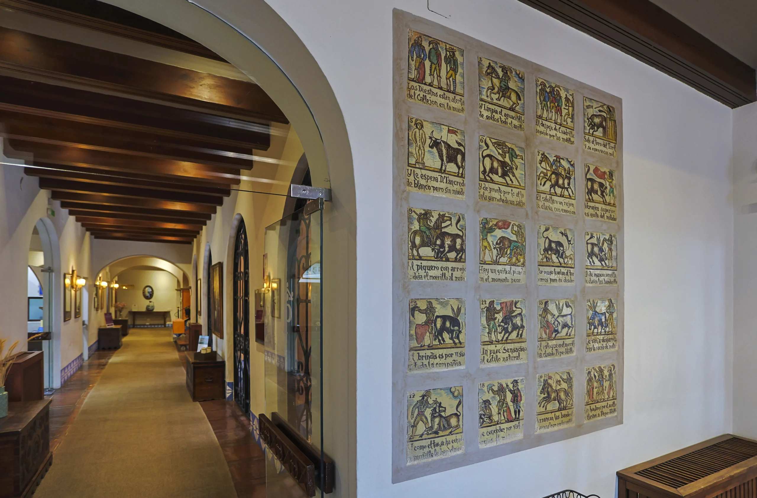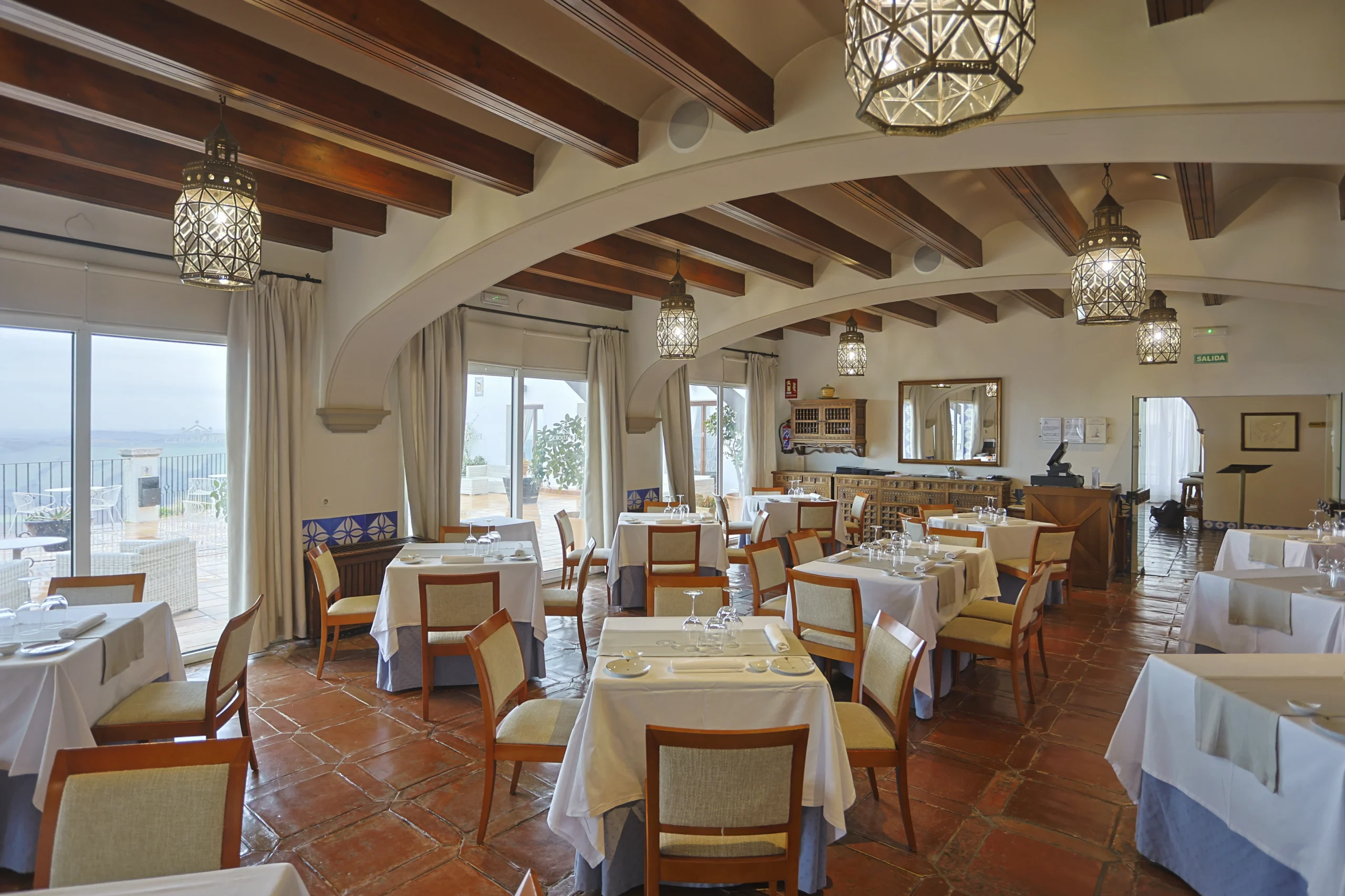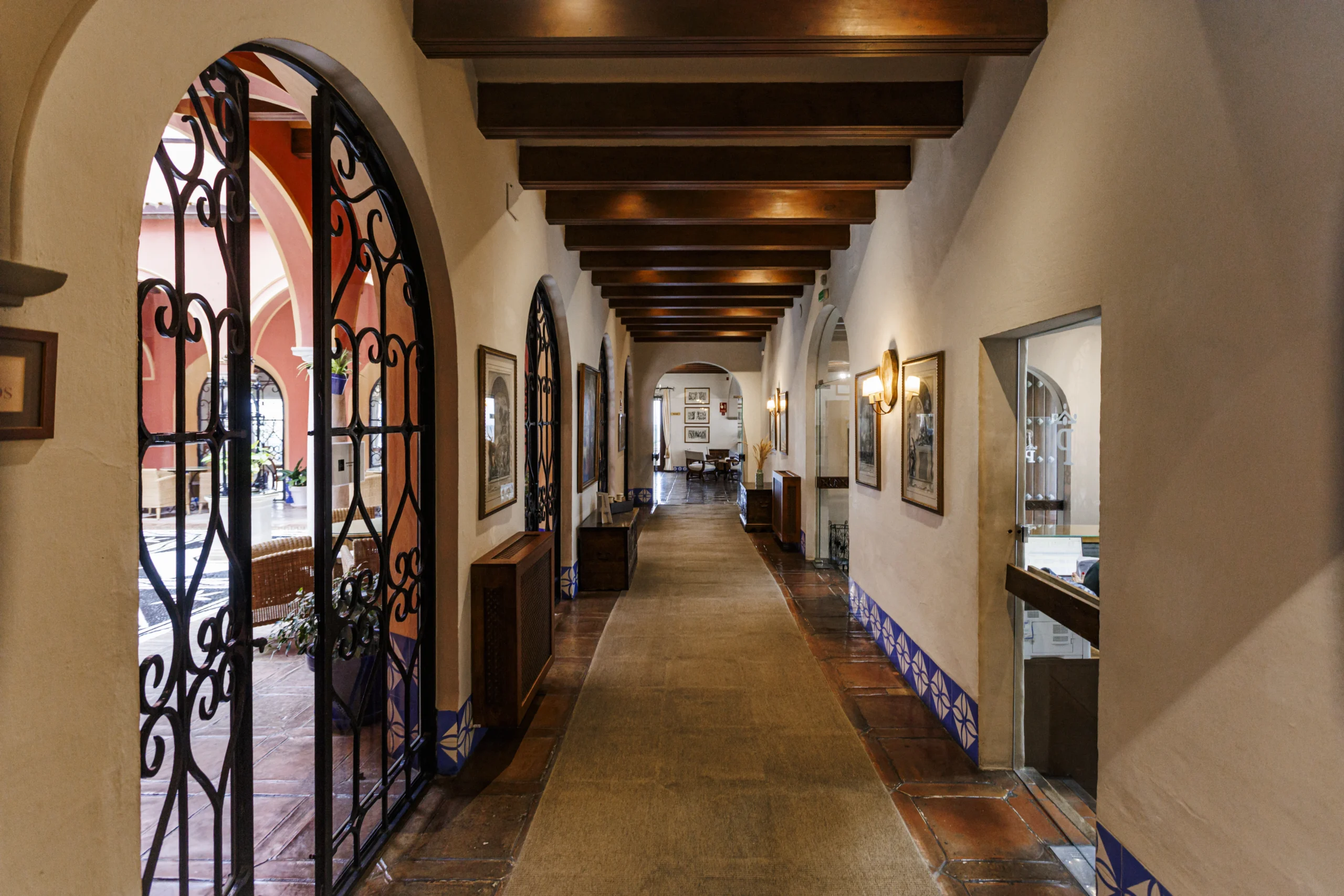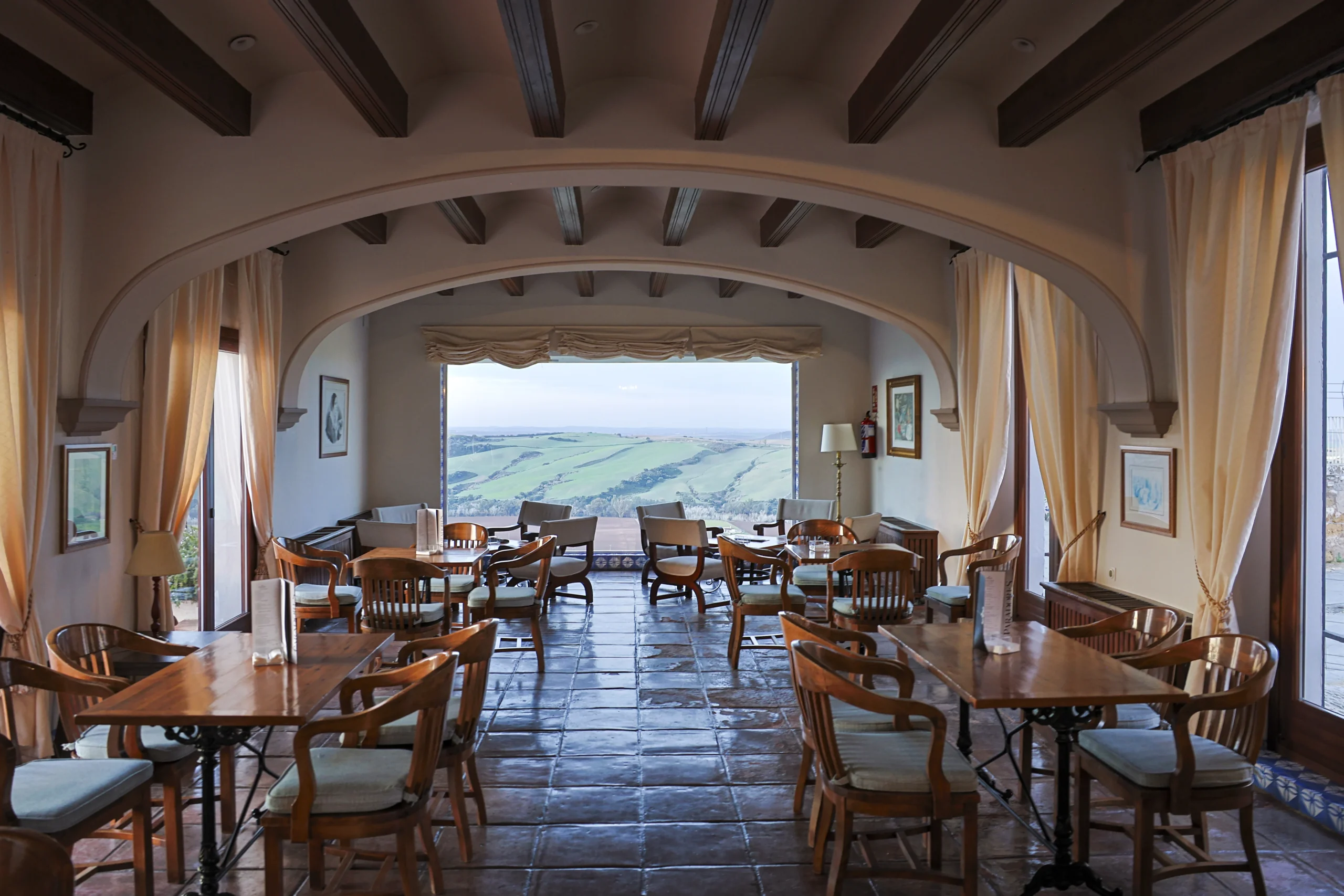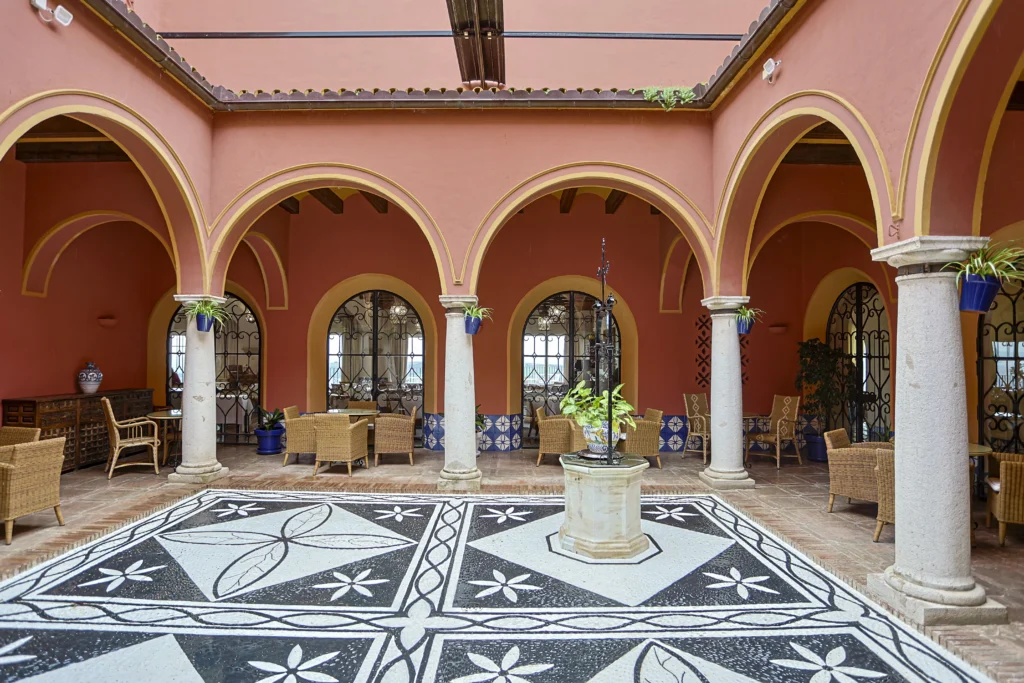 El mejor nexo entre ambas esferas, es la terraza del Parador, para dominarlo todo, para deleitarse con esas vistas henchidas de calma. Este mirador es como una promesa, alberga lo mejor del paso del tiempo, los mejores amaneceres, el sol durante el día y las líneas violáceas de un crepúsculo que se mezcla con los campos sin límites. El hecho de disfrutar de un café mientras uno goza del noble arte del dolce far niente es una experiencia trascendente. Erigido en 1966, su arquitecto, José Luis Picardo, proyectó un edificio sencillo que respetara el estilo del lugar; de hecho, su fachada es de estilo neoclásico, pero lo más llamativo es su interior: con un marcado espíritu neomudéjar que nos lleva directamente al patio andaluz con enrejados y azulejos que representan la obra de “El Corregidor y la molinera”, una carpintería fina con arabescos y pasillos plácidos de luz tenue anaranjada. La atmósfera que envuelve al edificio es el de las típicas casas andaluzas, con su zaguán. El nombre oficioso del Parador, además, es el de “El Corregidor”, por la leyenda que atraviesa Arcos.
