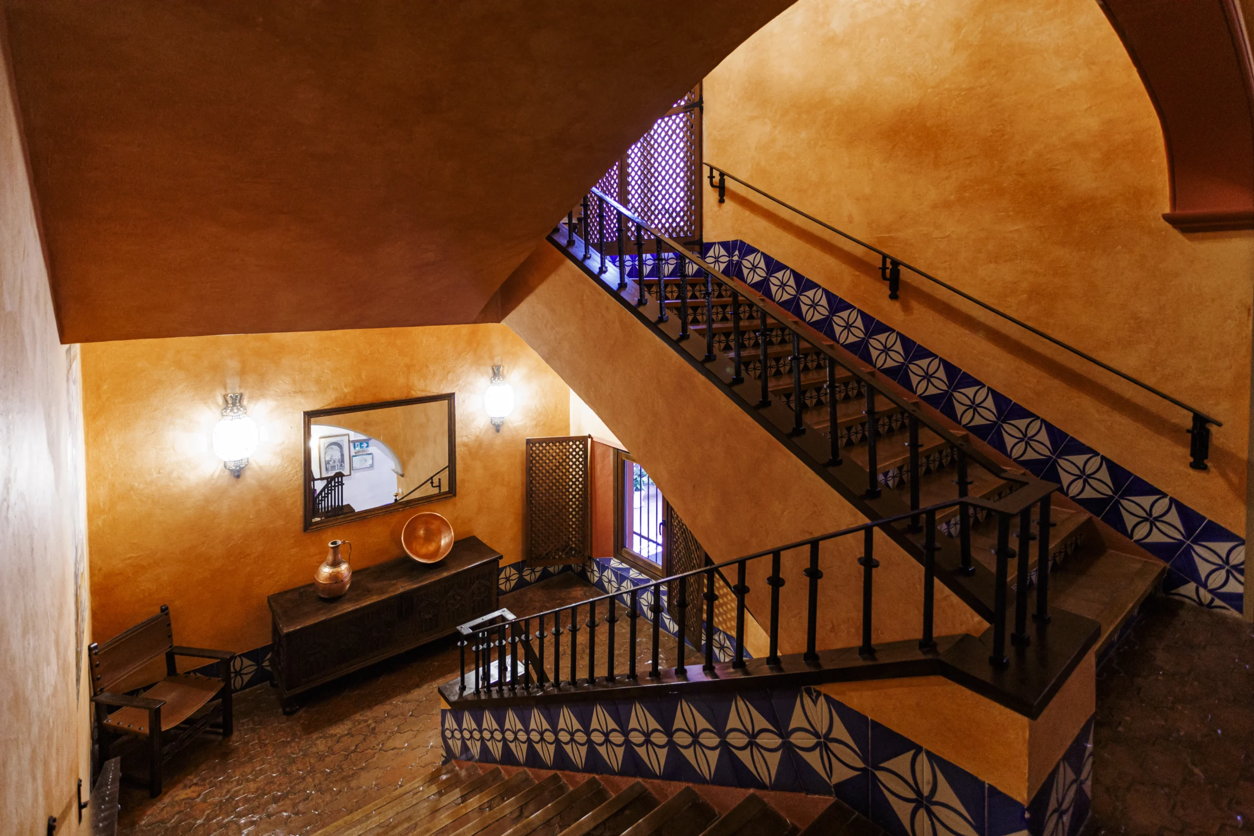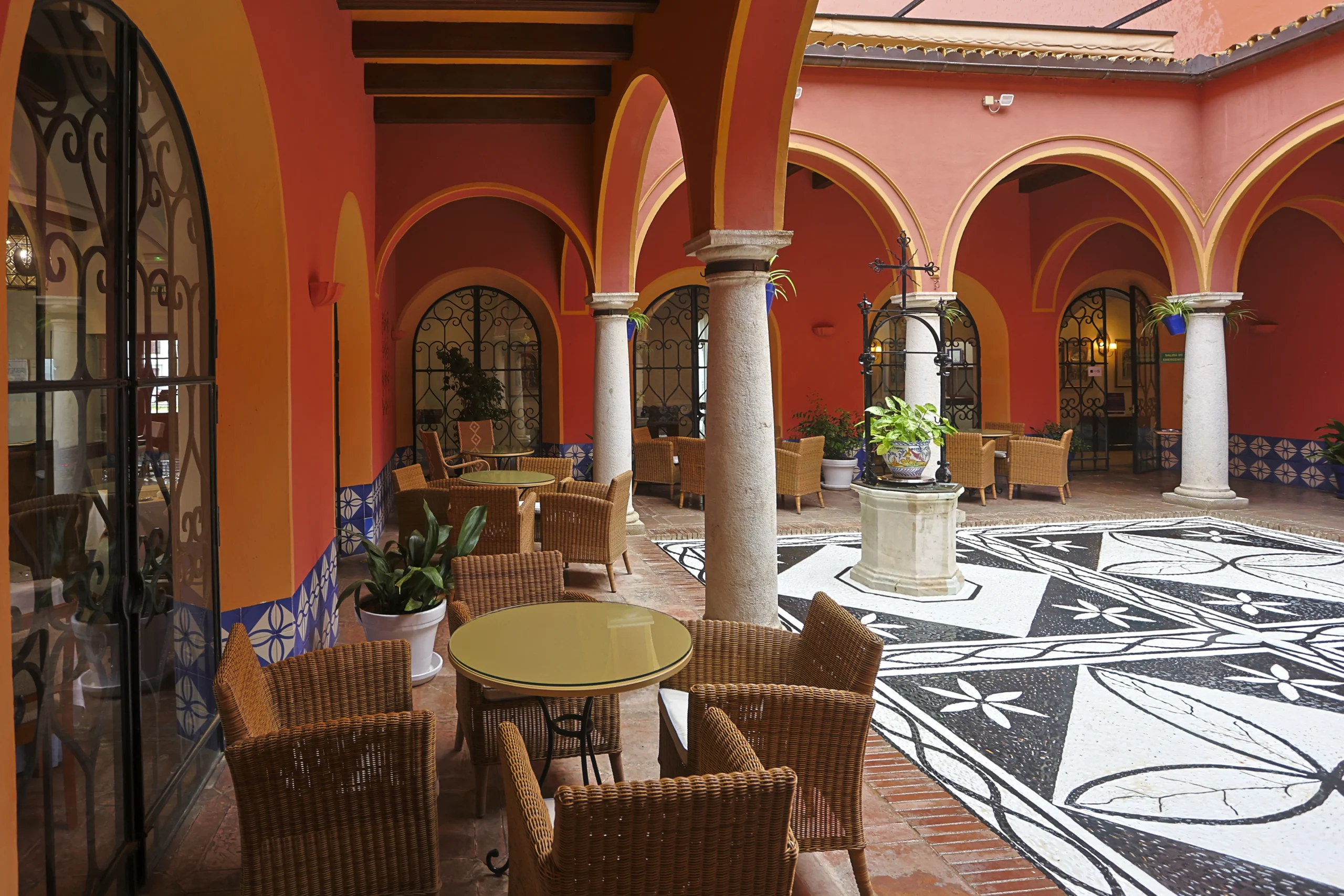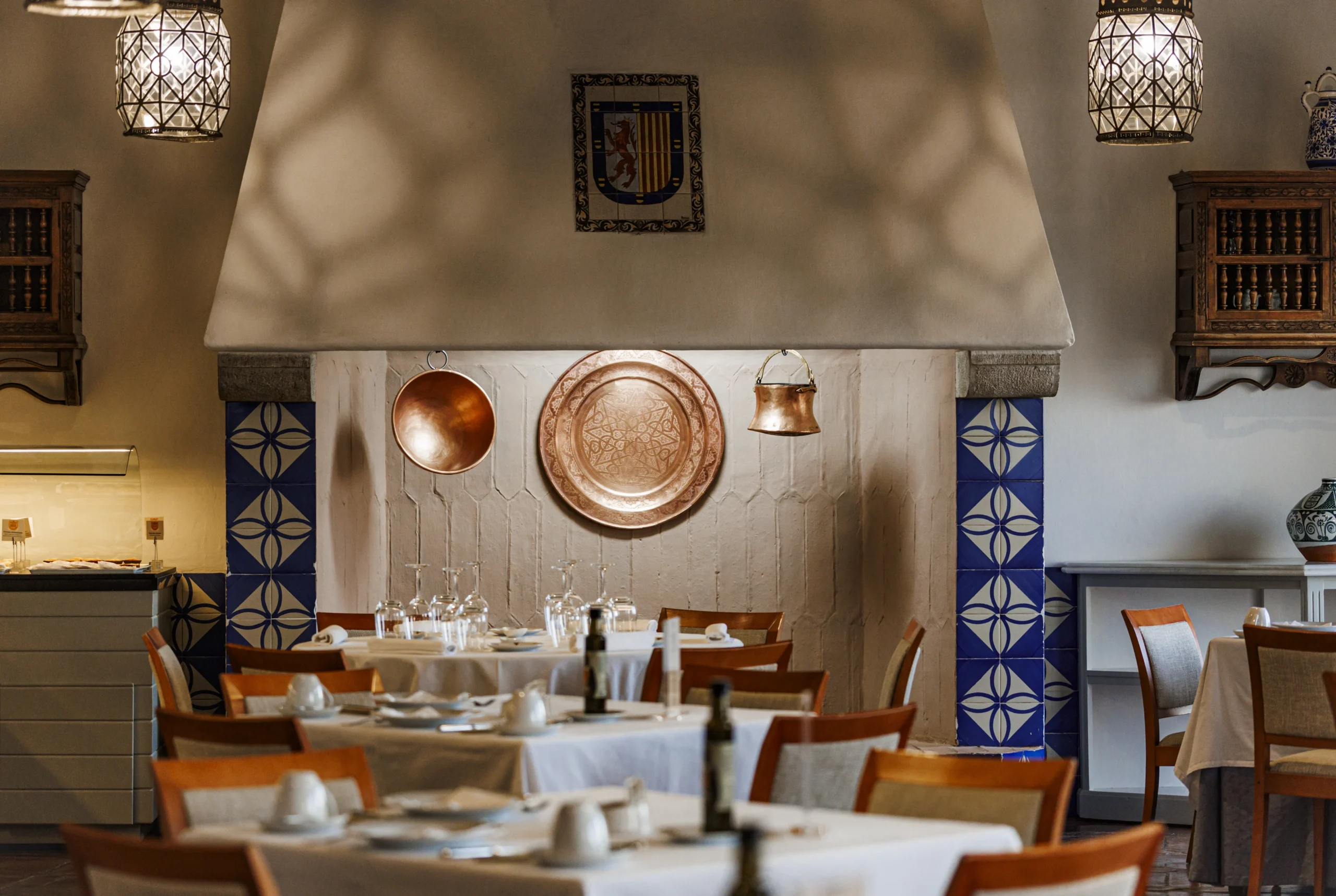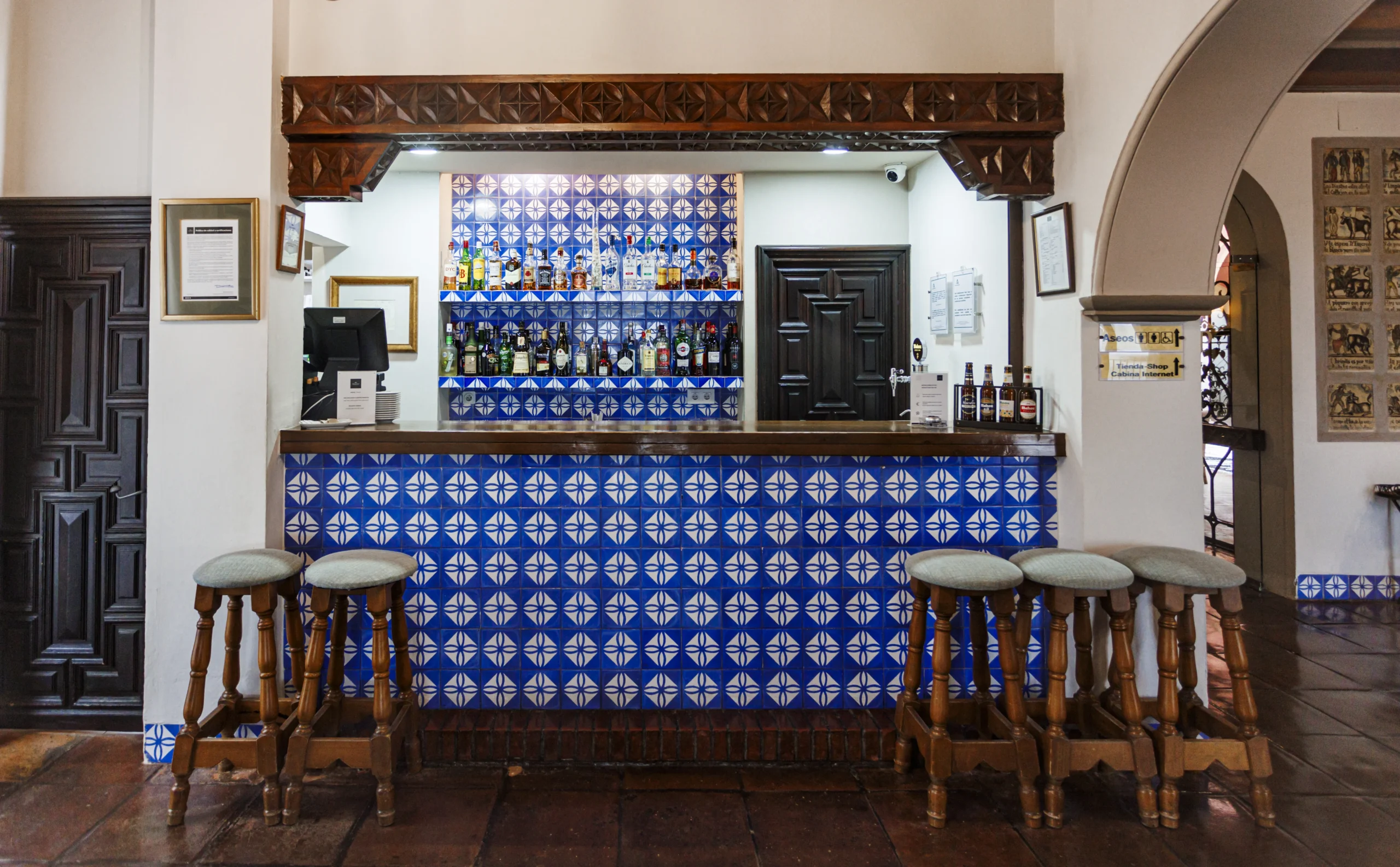 El mejor nexo entre ambas esferas, es la terraza del Parador, para dominarlo todo, para deleitarse con esas vistas henchidas de calma. Este mirador es como una promesa, alberga lo mejor del paso del tiempo, los mejores amaneceres, el sol durante el día y las líneas violáceas de un crepúsculo que se mezcla con los campos sin límites. El hecho de disfrutar de un café mientras uno goza del noble arte del dolce far niente es una experiencia trascendente. Erigido en 1966, su arquitecto, José Luis Picardo, proyectó un edificio sencillo que respetara el estilo del lugar; de hecho, su fachada es de estilo neoclásico, pero lo más llamativo es su interior: con un marcado espíritu neomudéjar que nos lleva directamente al patio andaluz con enrejados y azulejos que representan la obra de “El Corregidor y la molinera”, una carpintería fina con arabescos y pasillos plácidos de luz tenue anaranjada. La atmósfera que envuelve al edificio es el de las típicas casas andaluzas, con su zaguán. El nombre oficioso del Parador, además, es el de “El Corregidor”, por la leyenda que atraviesa Arcos.