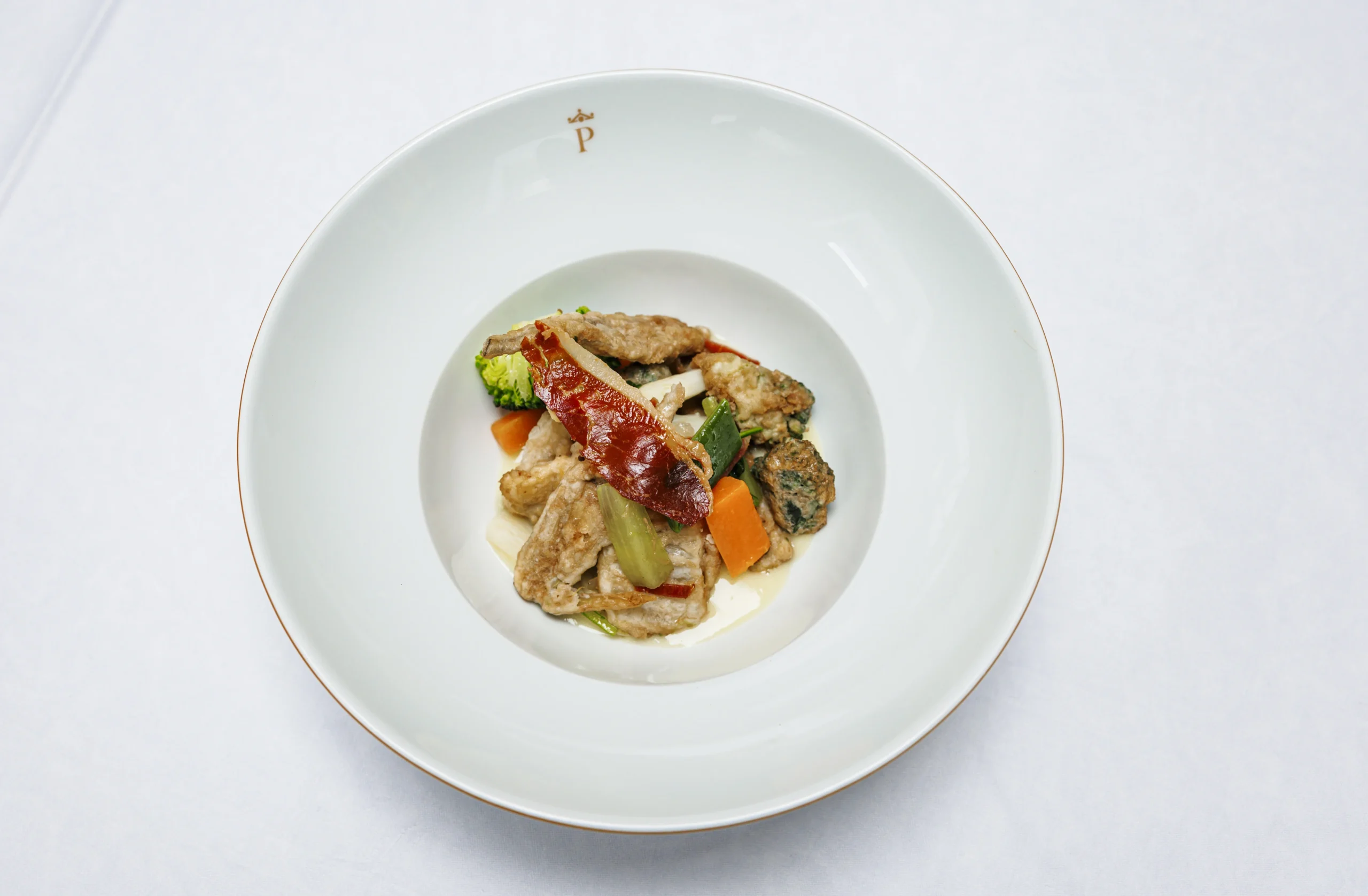 Esas verduras sirve para “abrir boca de forma suave”: los pimientos rellenos de bacalao con salsa verde es una opción maravillosa para empezar; luego el bacalao riojano con patatas del cura y pimientos del piquillo, con la salsa que prepara (intensamente naranja) consigue un sabor especial, fino y elegante. Después, “para continuar con una buena carne puedes probar el secreto, que lo hacemos a fuego muy lento y luego lo sellamos, con nabo, puré de lombarda y salsa de frambuesa”. El puré de lombarda es todo un descubrimiento que encaja con la carne de manera excepcional, consiguiendo una textura dulcemente evocadora.
