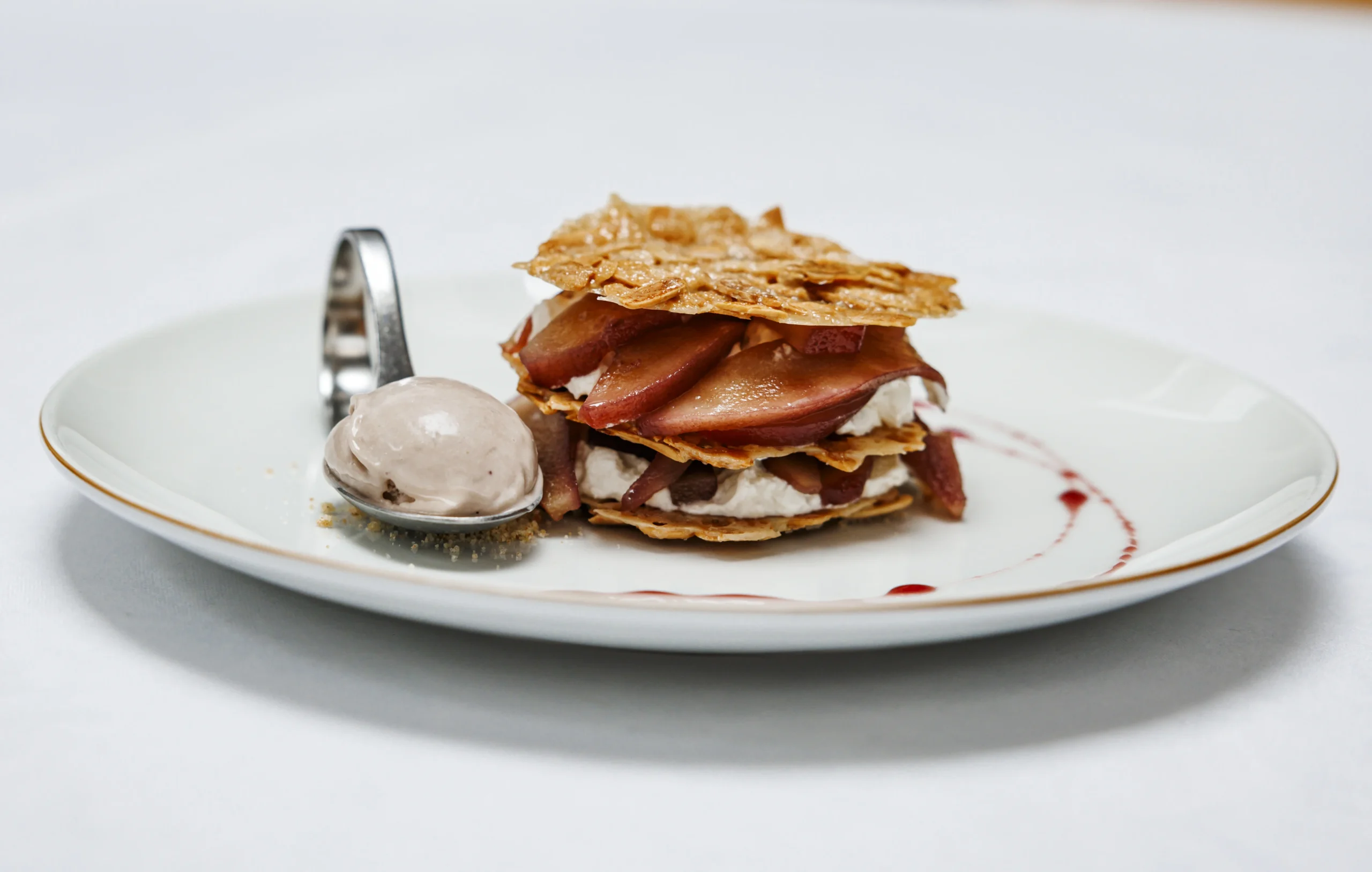 ¿De postre? ‘La pera que quería ser manzana’: se trata de una pera cocida, que se inserta en un molde de silicona con forma de manzana y se baña una verde y otra roja. Así, este trampantojo es un final dulce y llamativo. Para los más tradicionales pueden probar las peras cocidas, que se presentan con yogur y crujiente de almendra en una reducción y con helado de aceite de oliva. “Son peras al vino de toda la vida, pero con esa ‘vueltita’”, concluye Joxean.