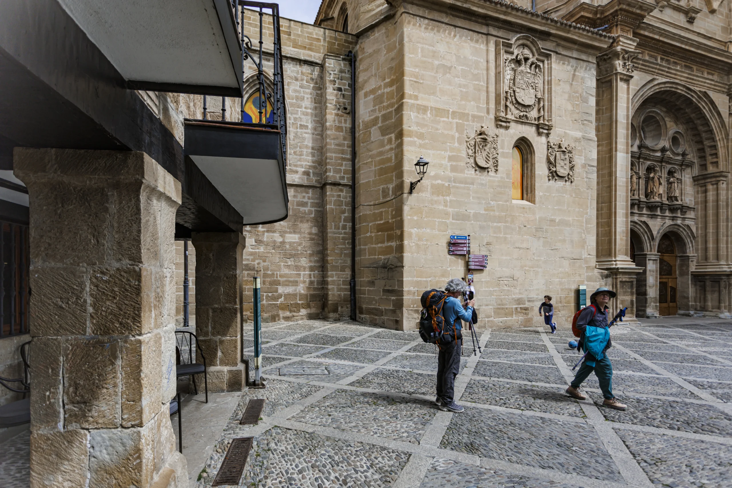 A pocos metros de la catedral, este testimonio del espíritu jacobeo, permite recordar a los caminantes que venían fatigados desde Nájera o Logroño, pidiendo refugio y algo de comida. El gótico del edificio se ha respetado en las sucesivas reformas, una sobriedad que no es menos imponente. Por dentro, los techos altos, los arcos y la calma consiguen ese aura que tanto llama la atención a quienes pasan por aquí. Pilar lo resume con claridad: “Este edificio nació para acoger y lo sigue haciendo”.