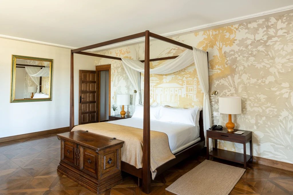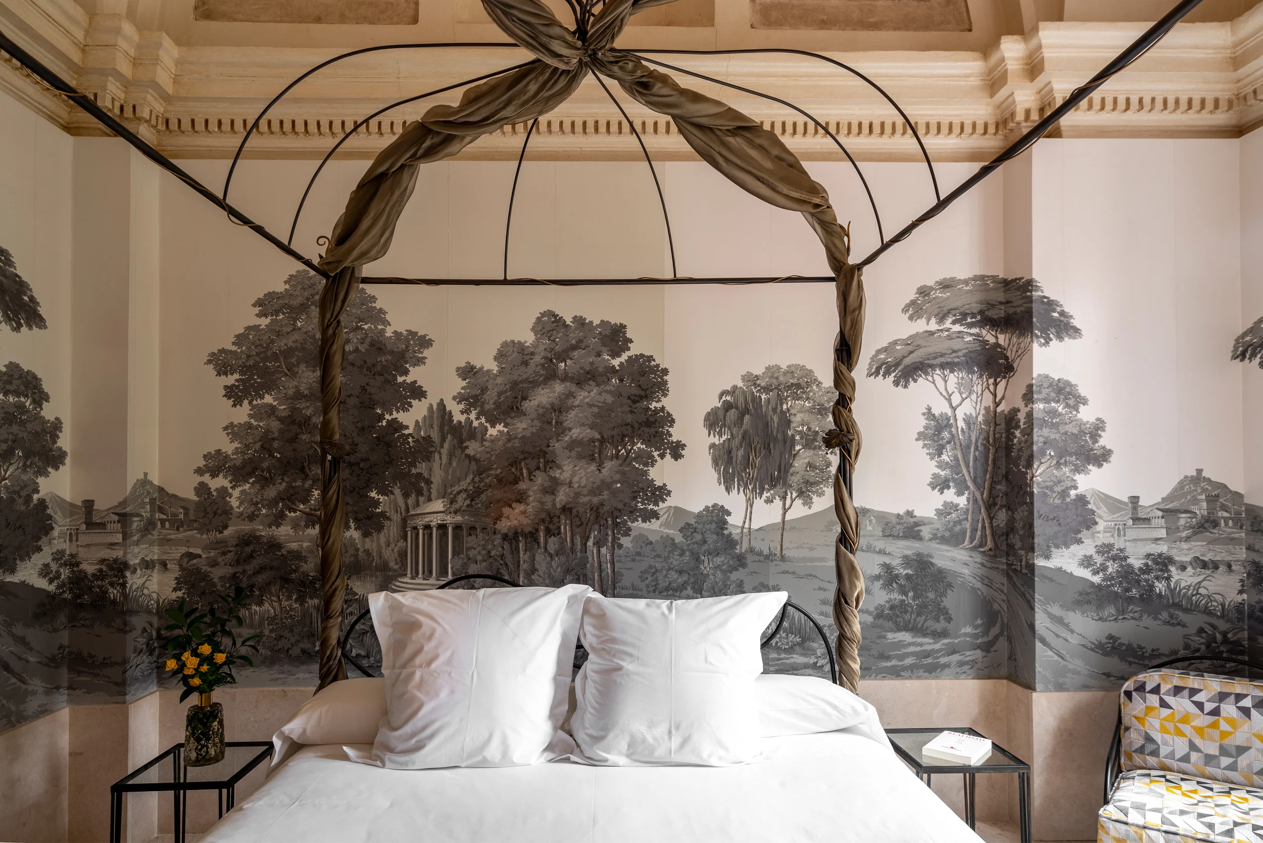 Con la quietud de las vistas al jardín y dejándose envolver por el encanto de los murales de papel que decoran la pared y que evocan los jardines de Aranjuez, déjate caer en la impresionante cama con dosel que los actores Margot Robbie, Pamela Anderson y Matt Dillon ya disfrutaron antes.