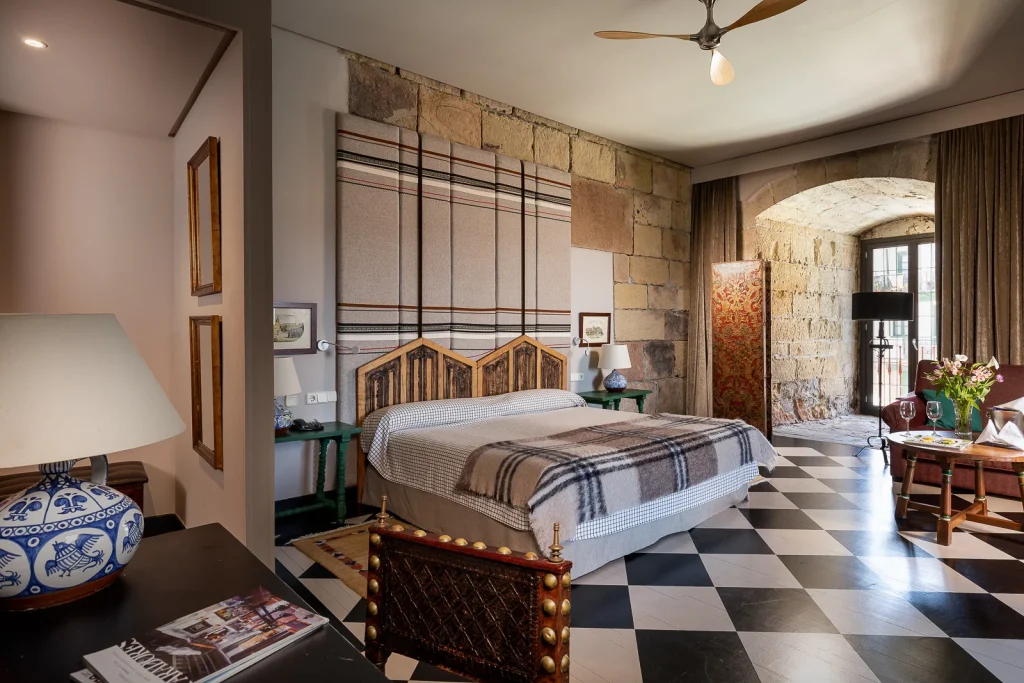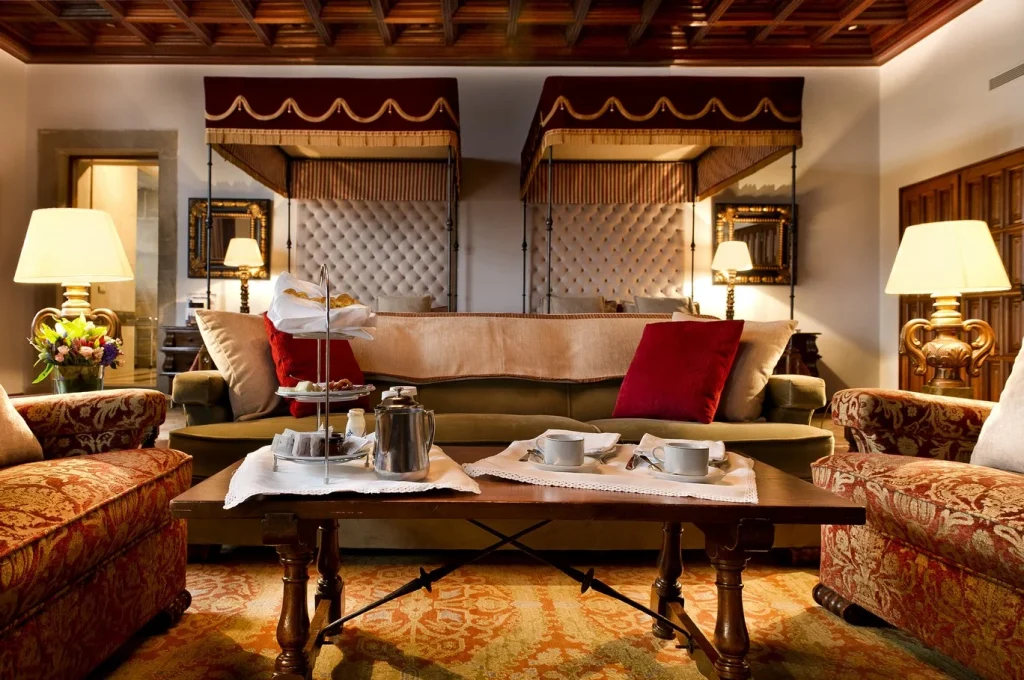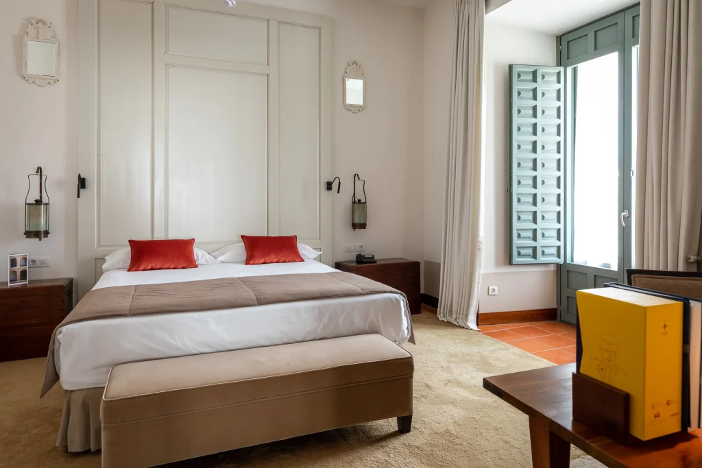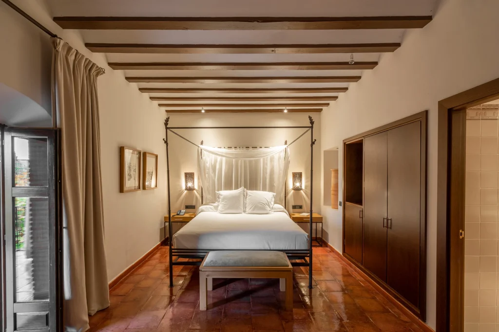 La habitación del Cardenal (329) del Parador de Santiago de Compostela, considerado el hotel más antiguo de España, es una de las más nobles del antiguo hospital de peregrinos. En ella durmió el cardenal Roncalli antes de convertirse en el Papa Juan XXIII, pero también uno de los músicos más legendarios: Mick Jagger, durante las fiestas del Xacobeo de 1999. Con artesonado mudéjar, sillón frailero del siglo XVII, cuadro barroco de Santa Dorotea, chimenea de piedra y dos camas con dosel, esta estancia que mira a la Plaza del Obradorio, es puro espectáculo. La bañera de hidromasaje y el silencio monacal completan una experiencia que mezcla lo sagrado y lo profano con elegancia. Una estancia que será para ti como una sacrílega bendición.