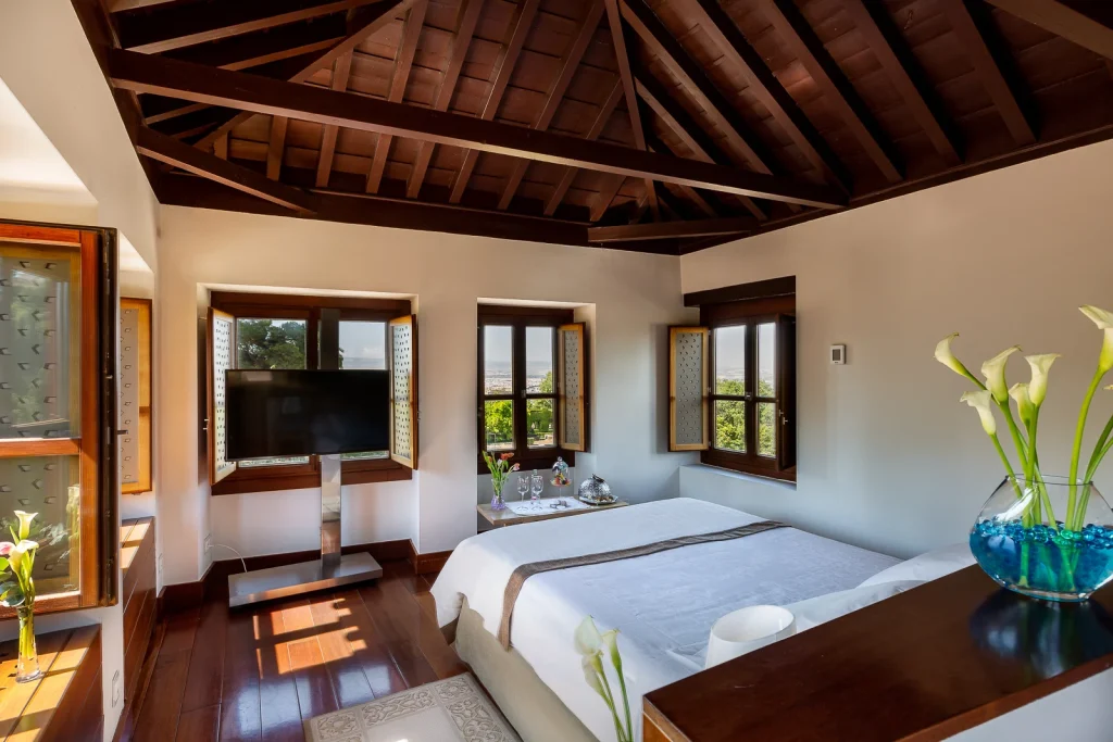 Cuando las guitarras dejan de sonar, el sueño emprende rumbo al sur, donde el descanso se vuelve leyenda entre el murmullo del agua, los muros nazaríes y el rojo eterno de la Alhambra. Disfrutar de un solo vistazo de Sierra Nevada, la vega de Granada y, además, de la Alhambra (del Palacio del Generalife y sus jardines y de la serena alberca del patio de los Arrayanes), es algo que sólo es posible desde una habitación muy especial del Parador de Granada, la 304 llamada Torre del Alba. Una estancia de dos plantas, con salón en la parte inferior y la zona de descanso en la parte superior, que brinda vistas de 360 grados. Puro espectáculo a merced de la historia, la naturaleza y la belleza en este Parador que se encuentra dentro del monumento más visitado de España, que además funcionó como el primer convento cristiano, levantado sobre un palacio nazarí.