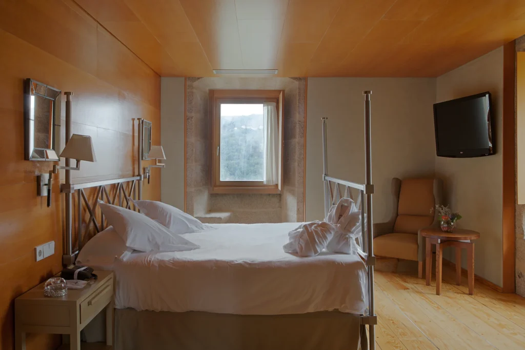 Otro tipo de descanso despierta ahora más al norte. Uno que busca serenarse en el silencio de un antiguo monasterio. La habitación 210 del Parador de Santo Estevo, en pleno corazón de la Ribeira Sacra, lleva el nombre del abad Franquila, el primero que dirigió este monasterio benedictino fundado en el siglo IX por el rey Ordoño II. Situada en la parte más alta del edificio, la estancia parece pensada para quien busca desconectar del mundo y entregarse al descanso con mayúsculas.