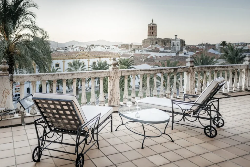 La terraza de la Sala Dorada (habitación 314) del Parador de Zafra regala una panorámica única. Descanso dentro, espectáculo fuera.