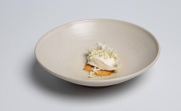 A continuación, la receta gira en torno a la coliflor. Un vegetal por el que el chef reconoce que siente predilección porque «puedes sacar un 200% de ella». Esta verdura se prepara en varias texturas: crema, sorbete y polvo. Se construye el plato con estas tres piezas y se acompañan de flores impregnadas en los aromas de la coliflor.