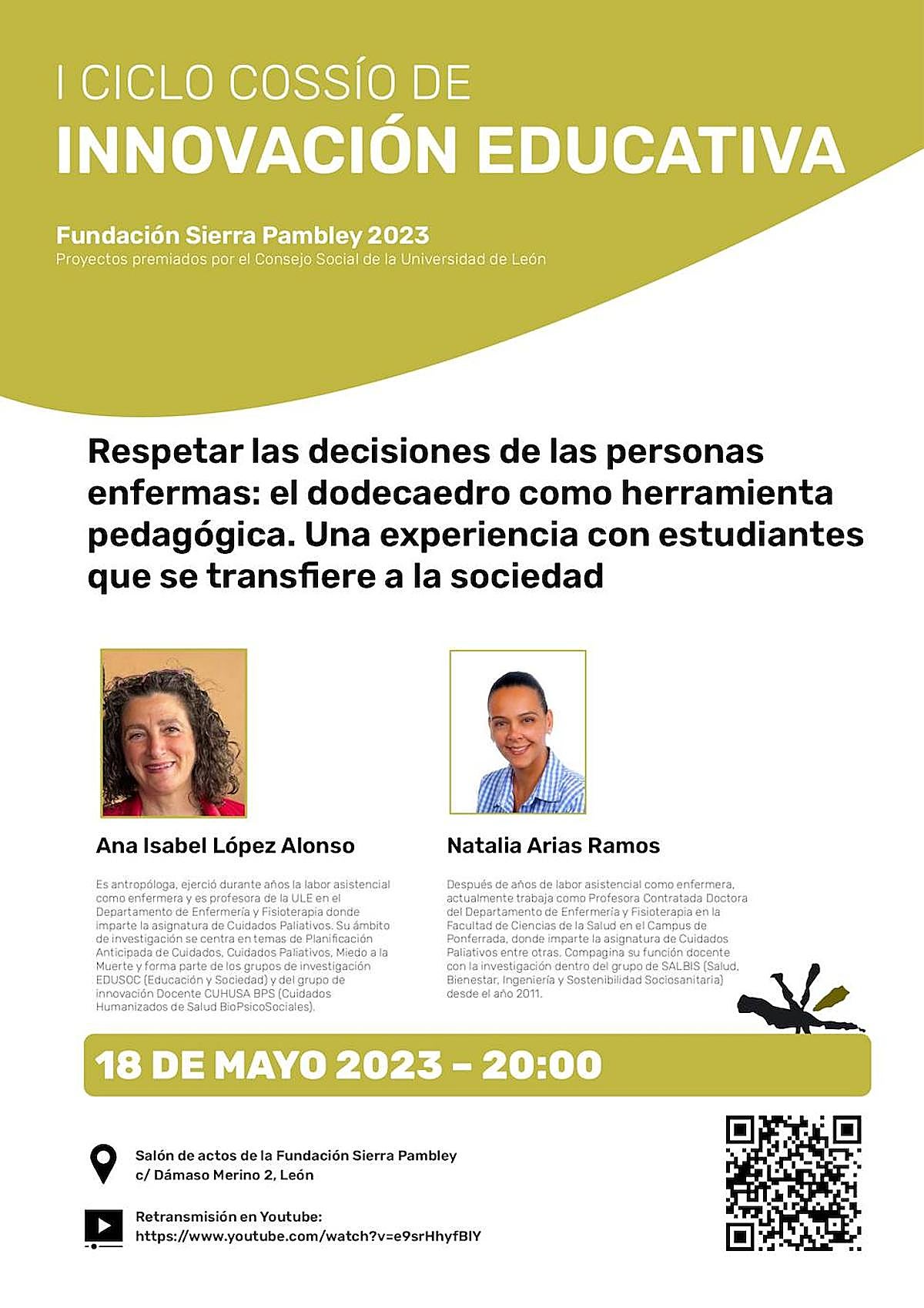 ¿Cómo se afrontan desde la enfermería las conversaciones con el paciente y su familia sobre los cuidados paliativos, sobre el miedo a la muerte? Ana Isabel López Alonso y Natalia Arias Ramos nos darán la respuesta en la tercera conferencia del I Ciclo de Innovación Educativa que organiza la Fundación Sierra Pambley y se celebrará el jueves 18 de mayo a las 20.00 h. en el Salón de Actos de la Fundación (entrada por C/ Dámaso Merino, N.º 2.). También se puede seguir en directo en este enlace https://www.youtube.com/watch?v=e9srHhyfBlY