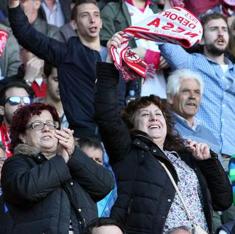 La Cultural y Deportiva Leonesa anima al público asistente al partido contra el Osasuna B a canta el himno de León en el minuto 23