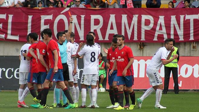 Las imágenes aportadas por el equipo leonés muestran que en la acción en la que se decreta la expulsión en realidad Regalón toca el balón y no al delantero del Osasuna B.