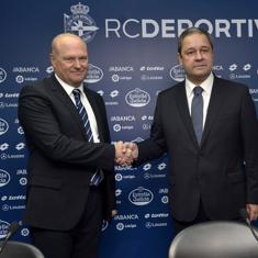 Pepe Mel estrecha la mano del presidente del Deportivo, Tino Fernández.