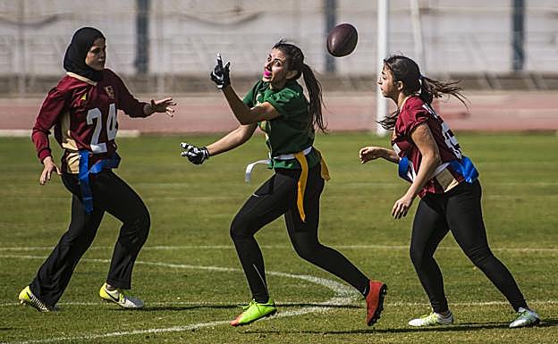 Las jóvenes egipcias que dan saltos en el césped de un estadio de El Cairo en este sábado primaveral no están ahí para animar a los chicos, sino para disputar un partido de fútbol americano. La primera vez que oyó hablar de ese deporte por una de sus amigas, Habiba Mahmud, una de las jugadoras, quedó desconcertada al pensar en la violencia de los choques. Pero ahora, la chica de 19 años juega al flag football, una variante del fútbol americano donde no hay placajes.