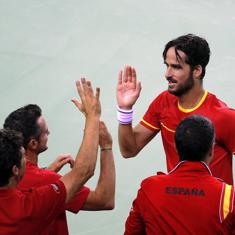 Feliciano López (derecha), celebrando la victoria ante Copil con el equipo español de Copa Davis.