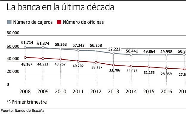 Desde 2015 hay 2.372 terminales automáticos más, mientras que el número de oficinas es un 40% inferior al que existía hace una década
