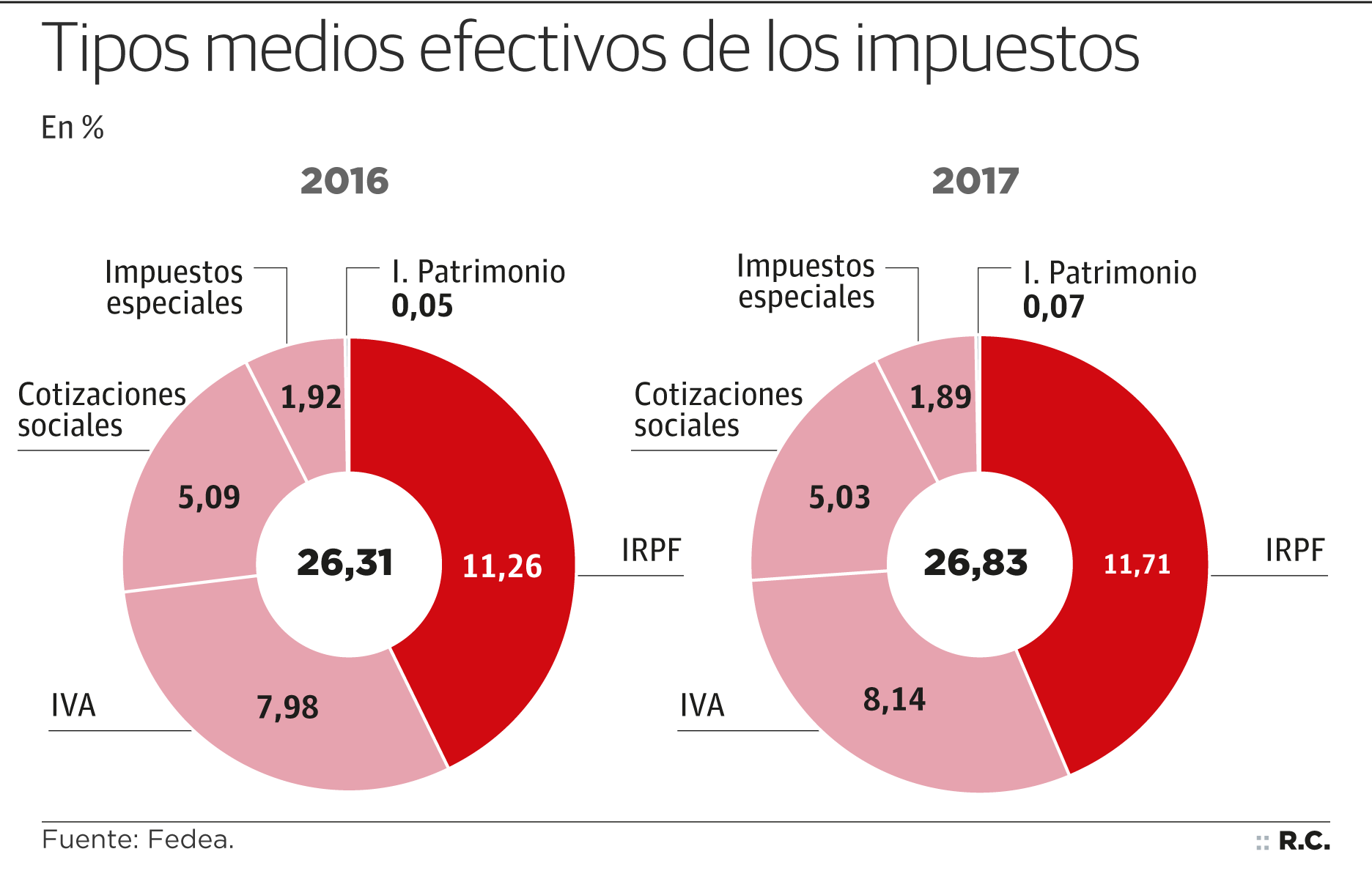 El análisis refleja a su vez que la presión fiscal se ha reducido de 2014 a 2017: el tipo impositivo medio ha pasado del 27,1% al 26,8%. Aunque este tipo crece con la renta, desde Fedea señalan que el que soportan los hogares más pobres (20% de las familias en el primer quintil de renta) es superior proporcionalmente al que corresponde a algunos tramos de hogares con una renta bruta mayor.