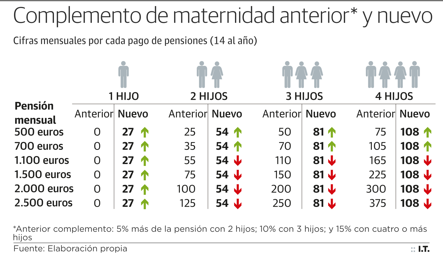 El PP se mostró a favor, al igual que el resto de partidos, en que se incluya ahora a las madres con un solo hijo (en el anterior diseño solo se abonaba a partir del segundo), pero criticó que la cuantía sea una cantidad fija de 27 euros por descendiente con un máximo de tres –y no un porcentaje como antes–, lo que penaliza a las familias numerosas y a quienes más han aportado con sus cotizaciones, lo que va en contra –afirmó– de la contributividad del sistema. Con el nuevo diseño las madres podrán cobrar un plus de entre 378 y 1.512 euros más al año, una cantidad que es sensiblemente inferior a la que ofrecía el anterior complemento, que oscilaba entre 1.700 y 5.000 euros al año, según precisó el diputado popular.