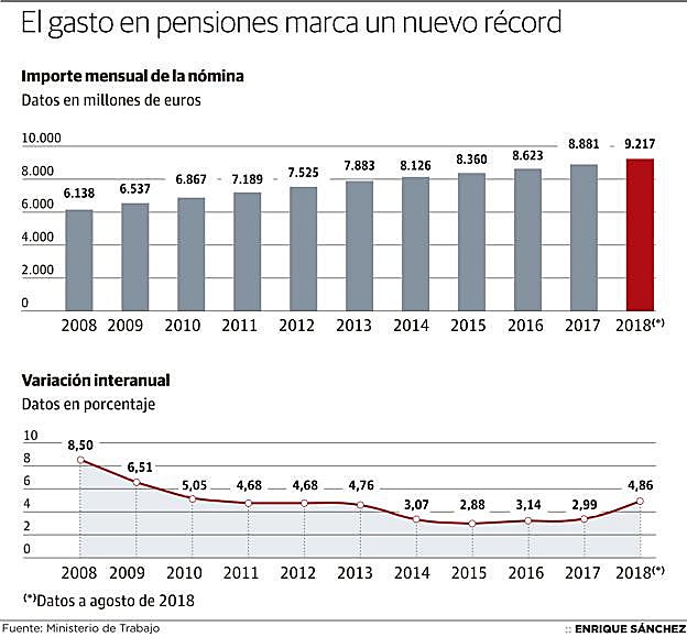 Supera por primera vez los 9.200 millones tras tener que abonar los atrasos y volverá a crecer si se actualizan al IPC con el pacto PSOE-Podemos