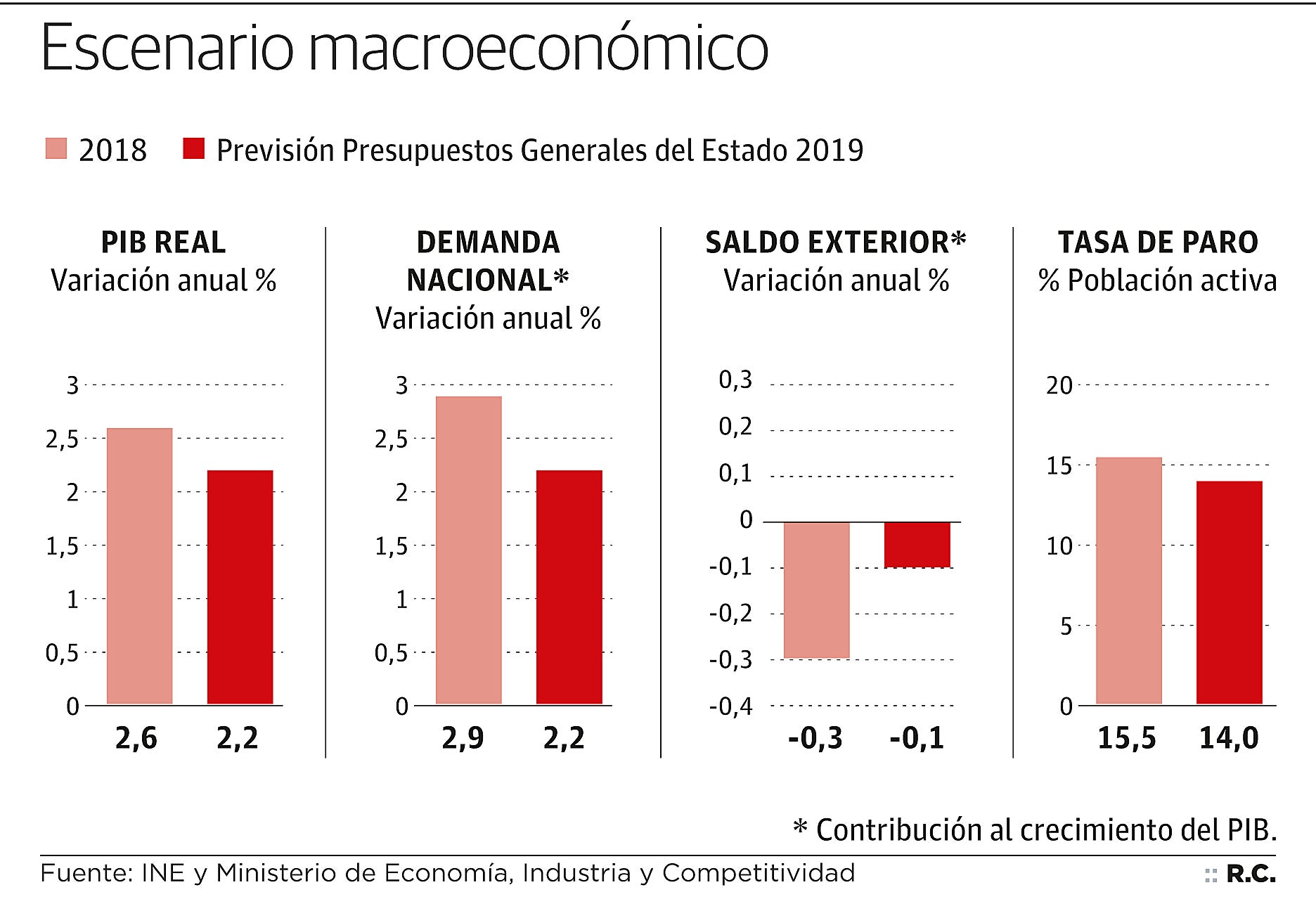 Más positiva es la previsión para el cierre de 2018, que la ministra Calviño espera que arroje un crecimiento económico del 2,6%, como estaba previsto. Esto supone un avance «muy por encima» de la media de los países de la eurozona. La titular de Economía ha explicado en rueda de prensa que la demanda nacional «sigue siendo el motor del crecimiento español», con una previsión de contribución al PIB del 2,2% en 2019, así como el dinamismo de la inversión.