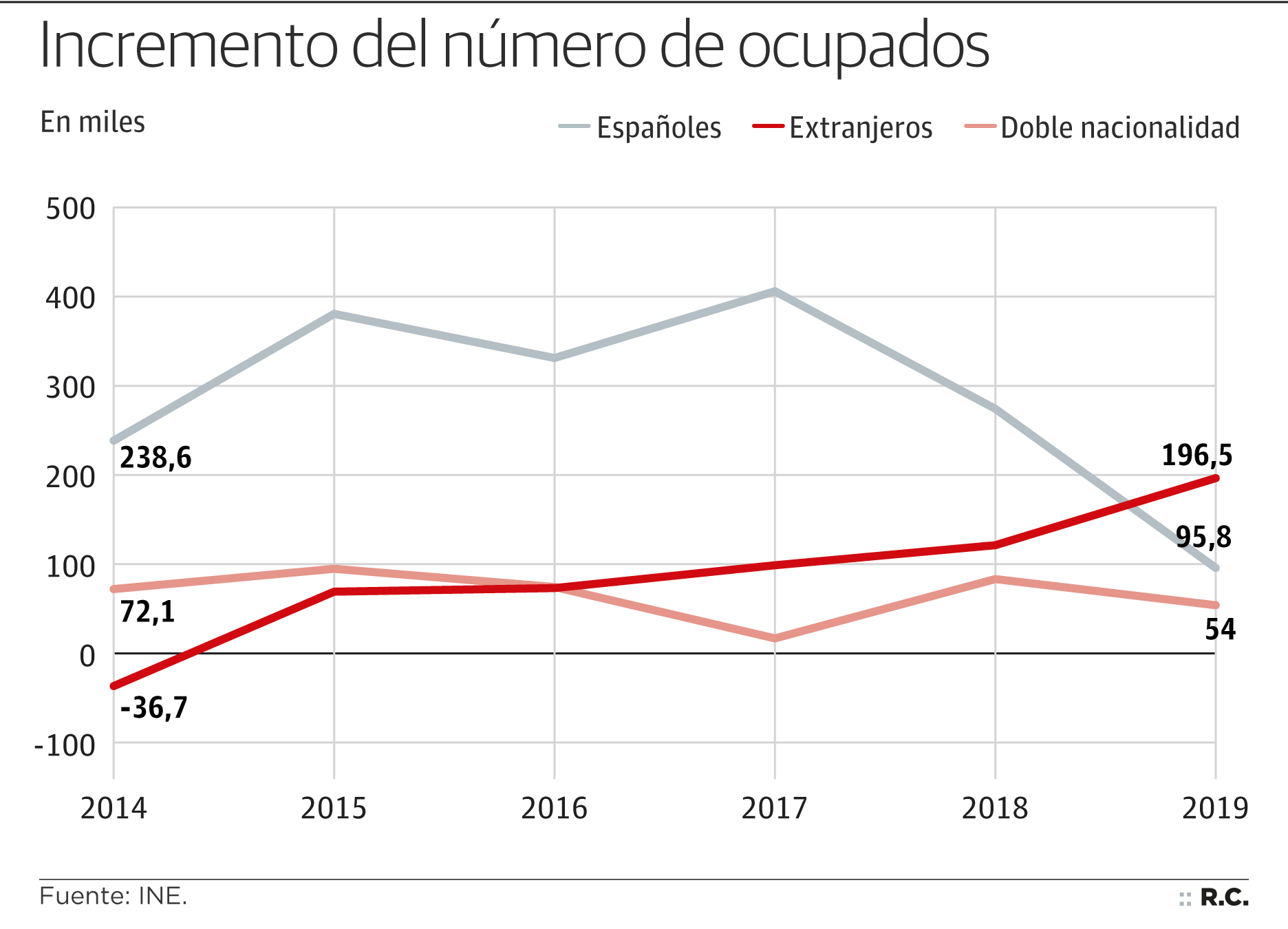 Hasta este año los nuevos empleos iban destinados a los españoles, principalmente. Así ha sido habitualmente, salvo casos puntuales, sobre todo en la etapa de llegada masiva de inmigrantes, y así se mantenía en esta última década... hasta 2019, cuando se rompe esta tendencia de forma drástica, además en un momento de desaceleración económica que ya tiene un fuerte reflejo en el mercado laboral español. Hasta el punto de que más de la mitad de los nuevos puestos de trabajo creados en el último año los acapararon los extranjeros, según los datos extraídos de la última Encuesta de Población Activa (EPA).