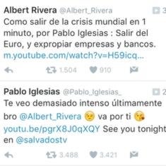 Cuando apenas quedan un par de horas para que se emita el segundo cara a cara entre Pablo Iglesias y Albert Rivera, ambos candidatos a la Presidencia en las elecciones generales del 26 de junio han empezado a calentar el debate en Twitter. El primer dardo lo ha lanzado Albert Rivera, compartiendo un vídeo de YouTube del programa Fort Apache - Europa ¿game over? en el que el líder de Podemos daba su receta para salir de la crisis. "Cómo salir de la crisis mundial en un minuto, por Pablo Iglesias: Salir del Euro y expropiar empresas y bancos", comenta con ironía el candidato de Ciudadanos.