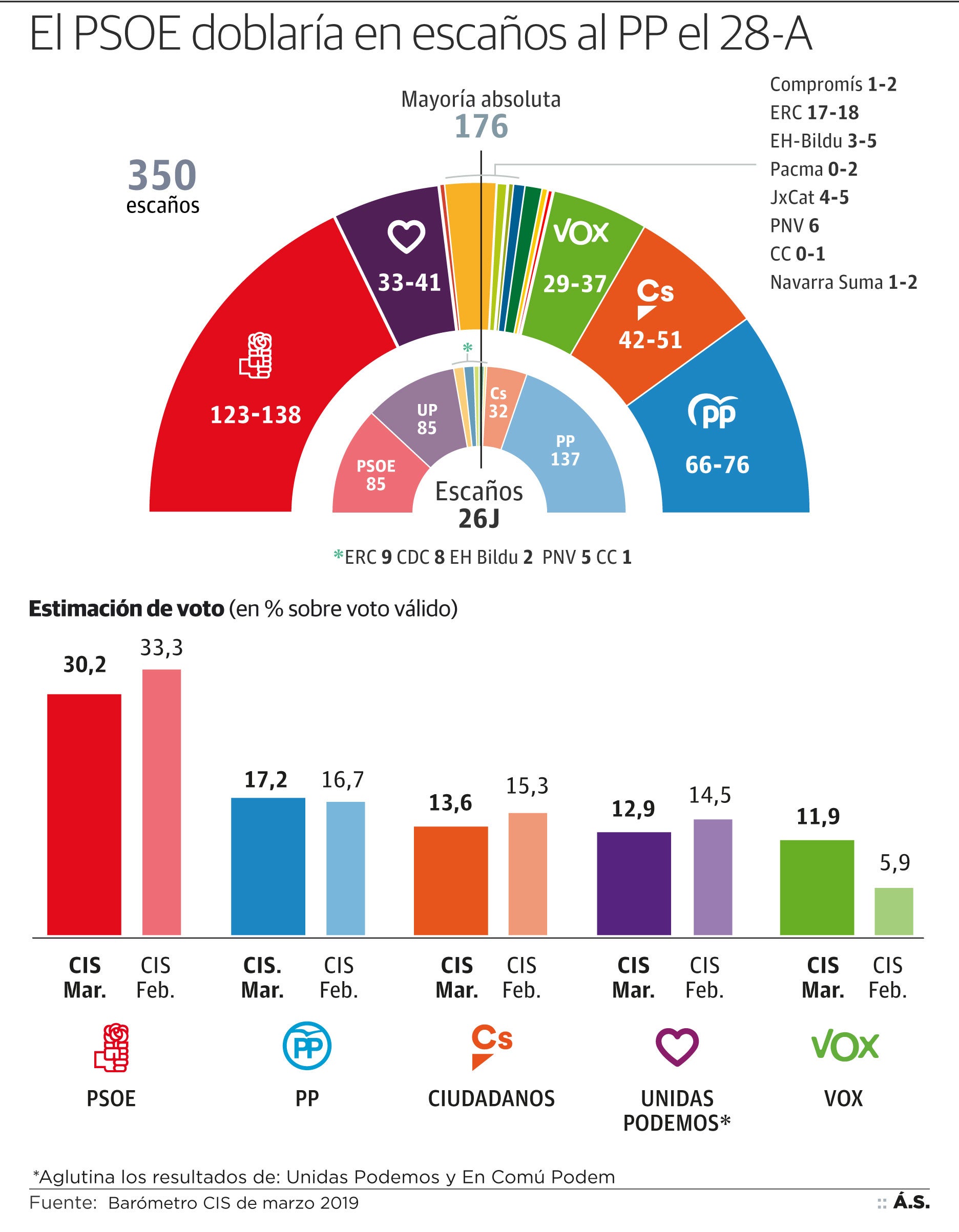 El PSOE ganaría y duplicaría los escaños del PP el 28 de abril. El amplio sondeo preelectoral del CIS señala que los socialistas obtendrían entre 123 y 138 diputados, y los populares se quedarían entre 66 y 76. Ciudadanos se consolidaría como tercera fuerza con entre 42 y 51 representantes en el Congreso, mientras que Unidas Podemos y Vox pelearían por la cuarta posición. Los morados sumarían de 33 a 41 escaños con la aportación de En Comú Podem mientras que la extrema derecha cosecharía de 29 a 37.