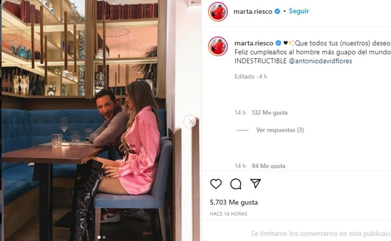 Las últimas declaraciones públicas de Marta Riesco en televisión y la sonrisa que se le escapaba ya hacían entrever que había retomado la relación con Antonio David, por más que ella intentara disimularlo. La reportera se había mostrado profundamente dolida y muy rotunda a la hora de poner punto final a su romance con el malagueño, pero este fin de semana la periodista ha publicado un posado de los dos juntos haciendo oficial de nuevo su noviazgo. Ha sido durante el cumpleaños de él y no ha dudado en enviarle un emotivo mensaje a través de su perfil de Instagram: «Que todos tus (nuestros) deseos se cumplan. Feliz cumpleaños al hombre más guapo del mundo… INDESTRUCTIBLE».