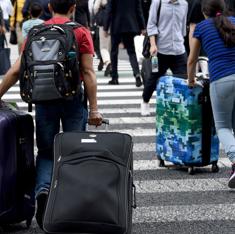 Extranjeros por las calles de Tokio con sus maletas.