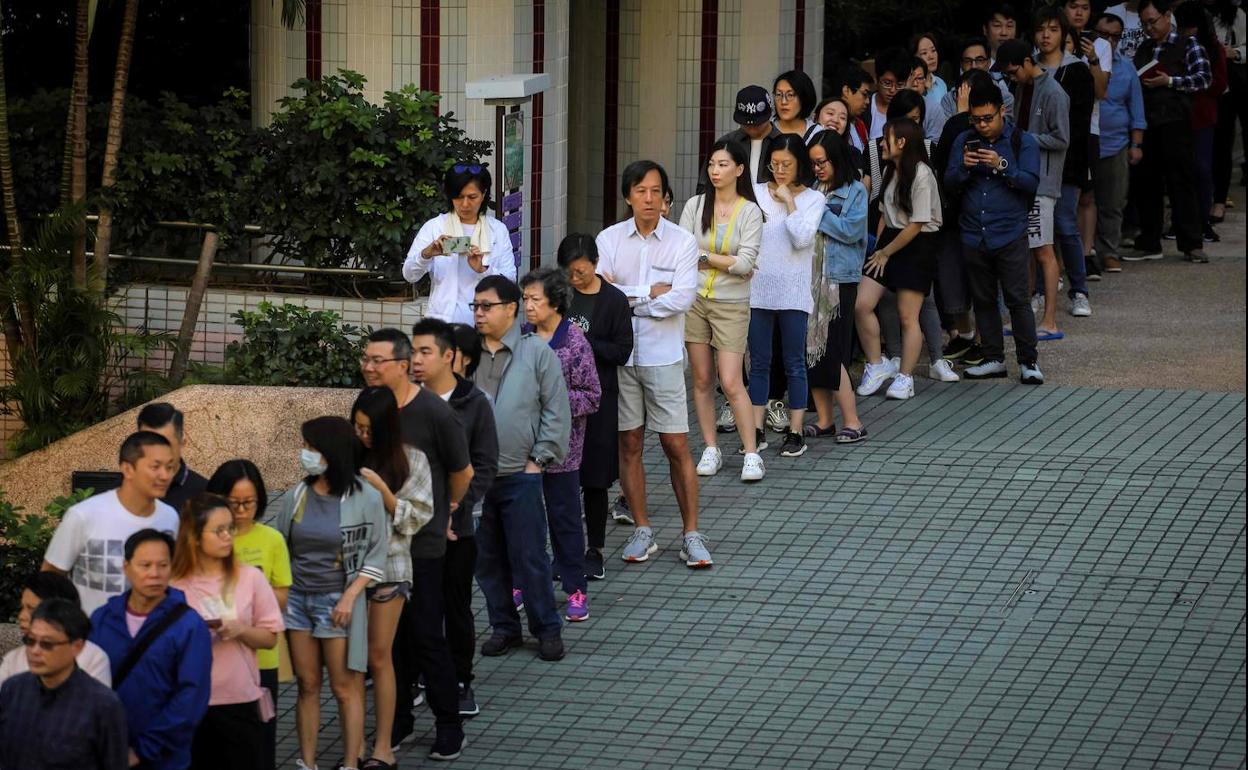 Decenas de hongkoneses hacen cola para ejercer su derecho a voto en las elecciones municipales celebradas este domingo. AF