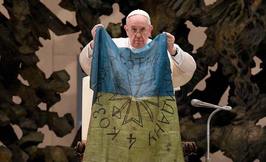 El Papa besó y bendijo este miércoles una bandera ucraniana llevada al Vaticano desde Bucha. Francisco condenó estas «atrocidades» y aseguró que «las noticias recientes sobre la guerra en Ucrania, en lugar de traer alivio y esperanza, evidencian que se han cometido masacres». El Pontífice subrayó que la guerra está derivando en «crueldades cada vez más horrendas, también cometidas contra civiles, mujeres y niños indefensos».