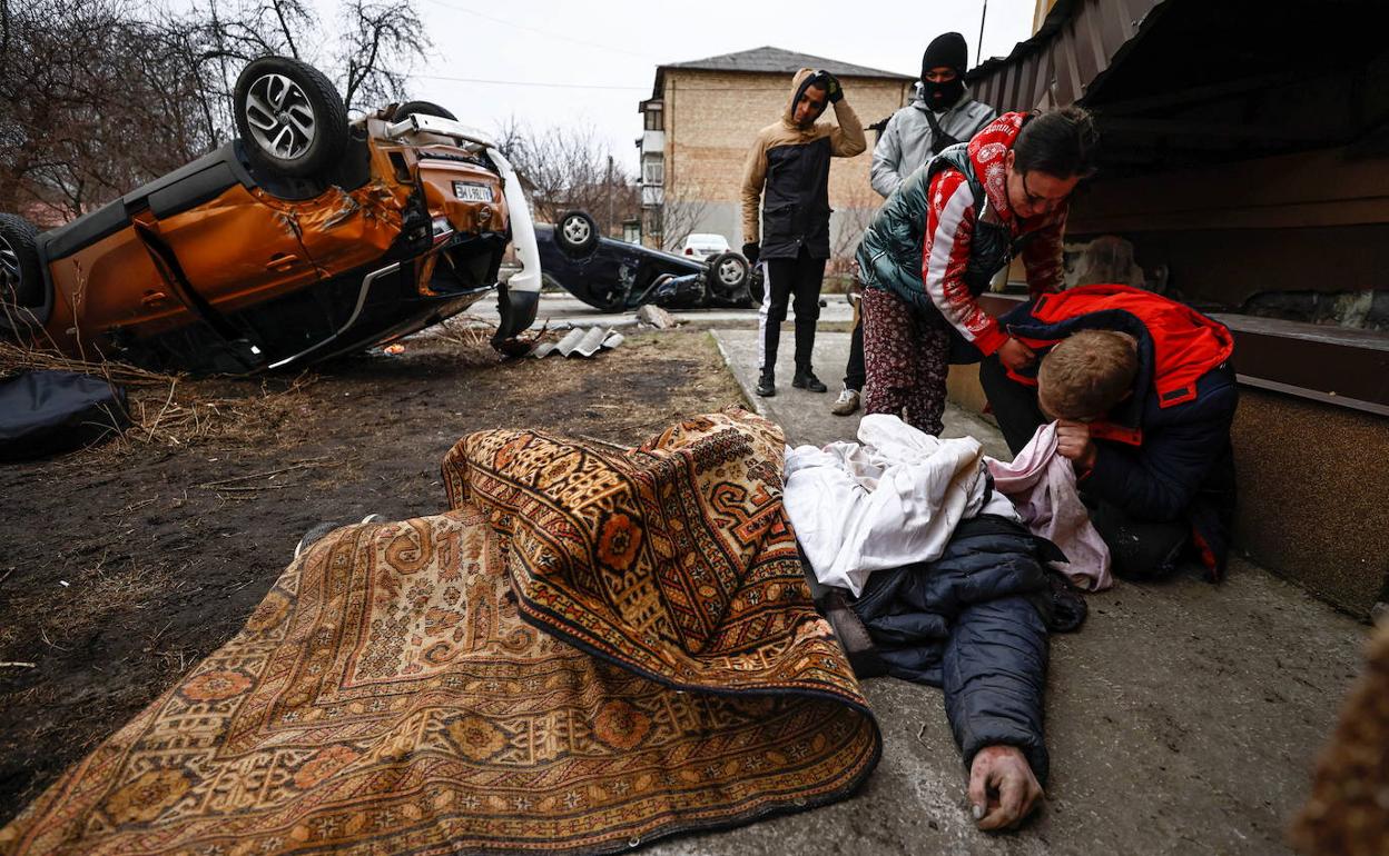 Sergey Lagovskiv, de 26 años, llora junto al cuerpo de su amigo Igor Lytvynenko, que fue asesinado por soldados rusos, después de que lo encontraran en el sótano de un edificio, en Bucha. Reuters/Vídeo: Atlas