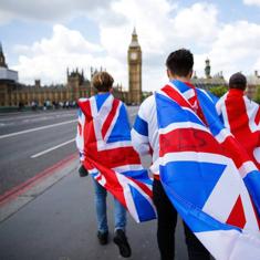 Jóvenes con la bandera de Reino Unido frente a la Cámara de los Comunes.